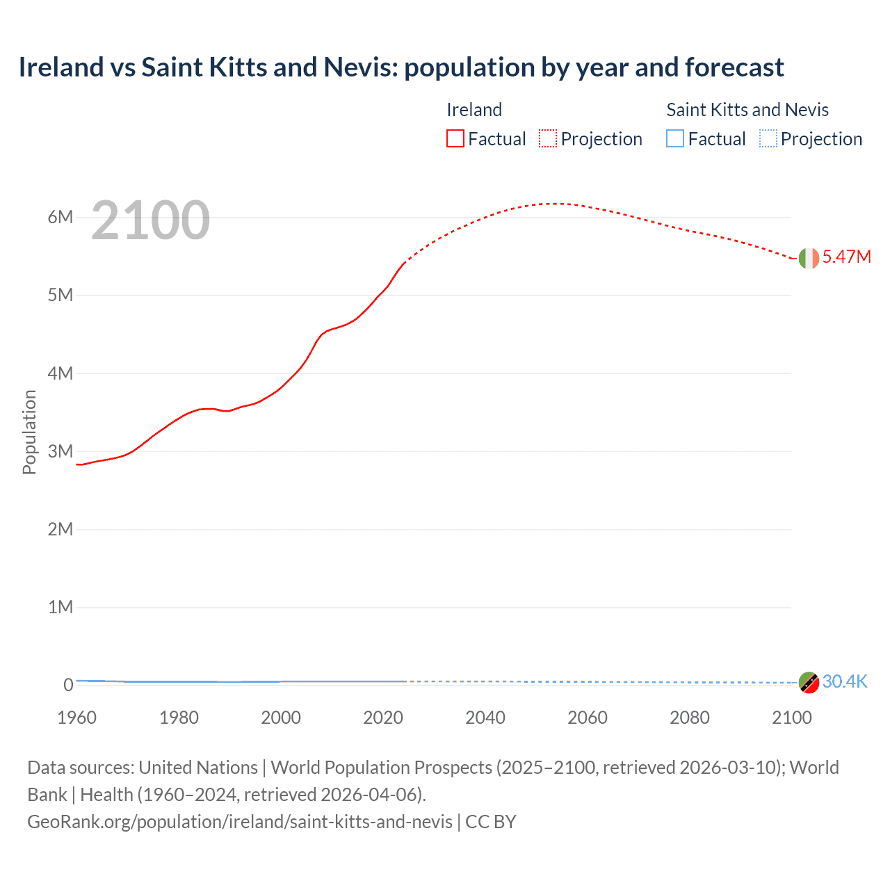 The latest officially reported population of Ireland was 5,395,790 in 2024 vs 46,843 people in Saint Kitts and Nevis in 2024. In 2026, based on the adjusted UN estimation, the current Ireland's population is 5,518,360 people compared to 47,017 in Saint Kitts and Nevis.