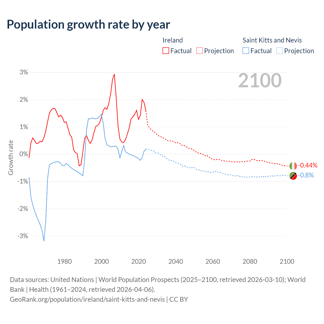 - For the last 10 years, Ireland has had an average growth rate of +1.41% per year vs -0.04% in Saint Kitts and Nevis.