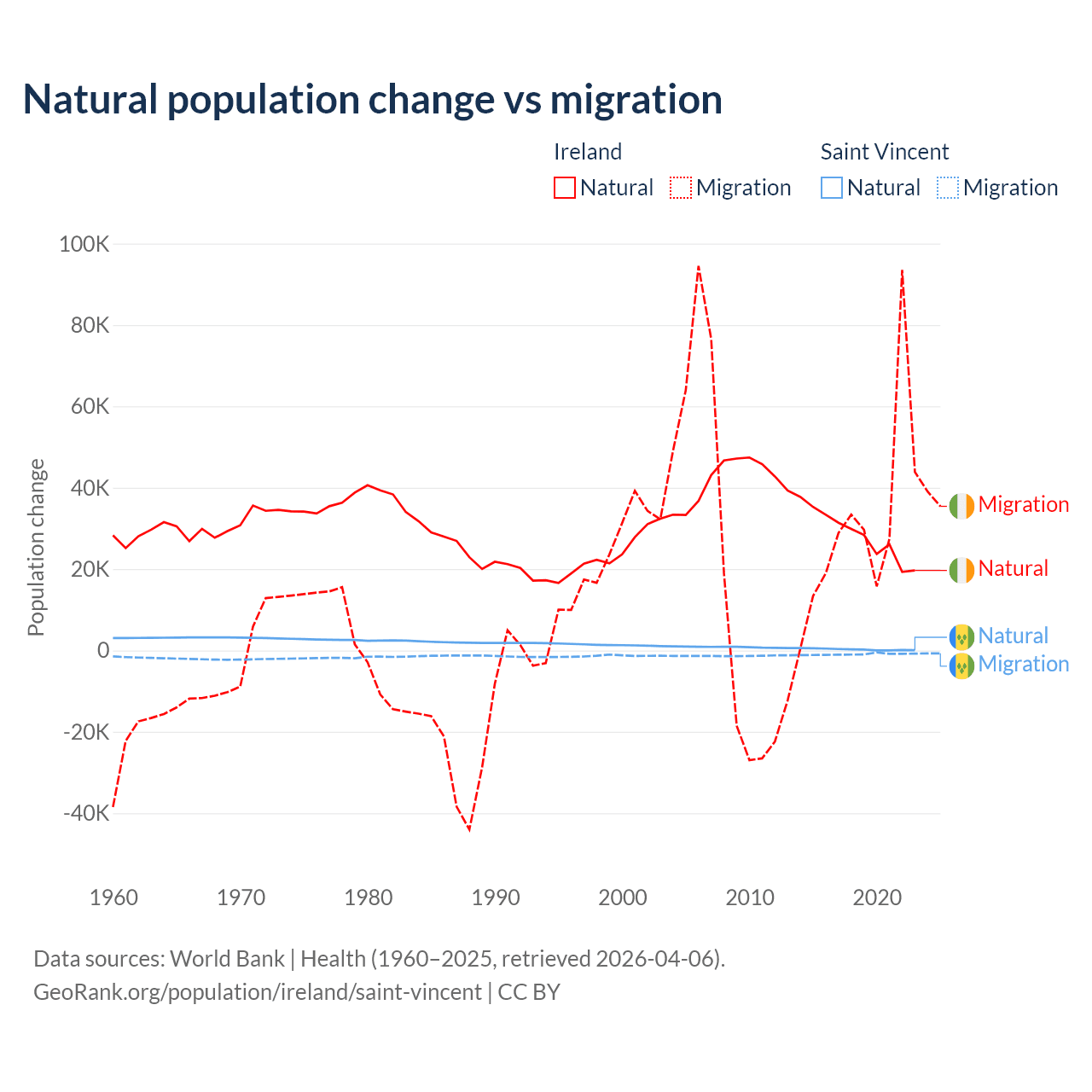 Over the last 10 years, 48.2% of the population change in Ireland is from natural causes (a gain of 284,644 people) and 51.8% is from migration (a gain of 305,297 people). In Saint Vincent 21.2% is from natural causes (a gain of 2,525 people) and 78.8% is from migration (a loss of 9,393 people).