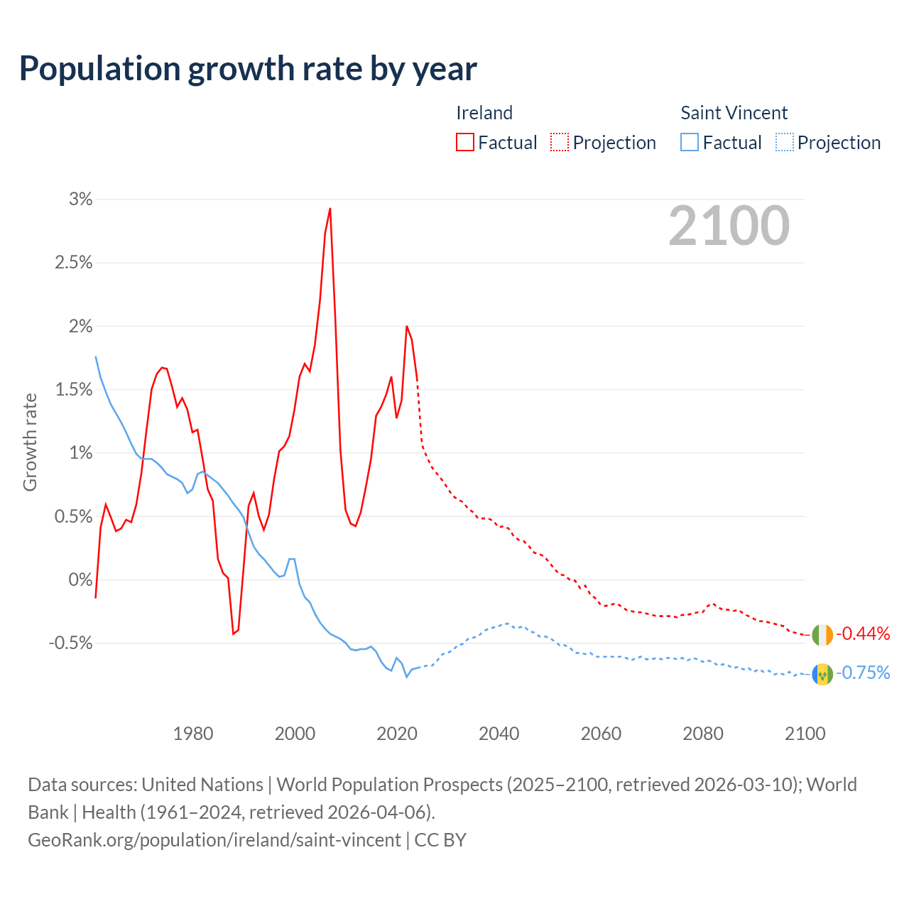 - For the last 10 years, Ireland has had an average growth rate of +1.41% per year vs -0.65% in Saint Vincent.