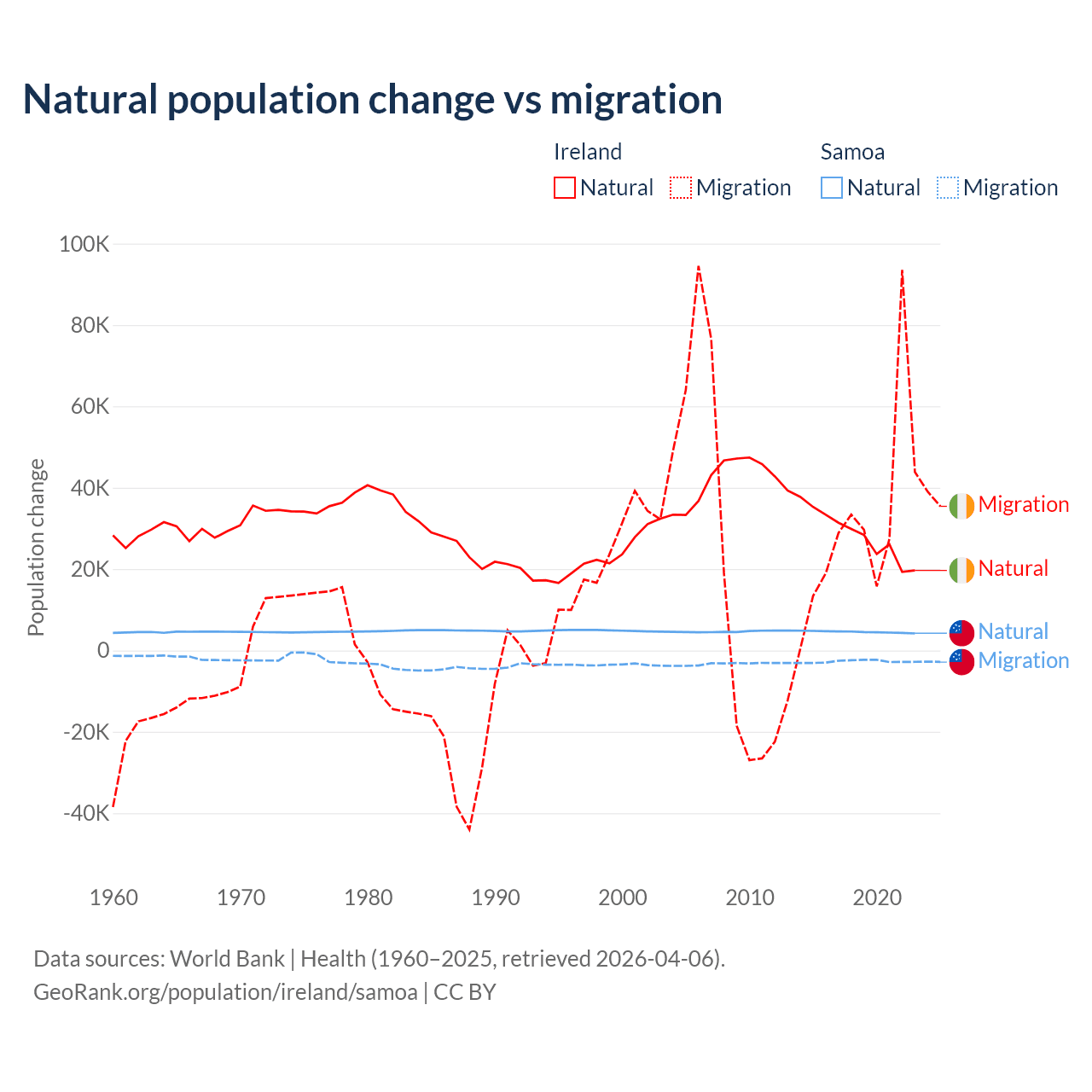 Over the last 10 years, 48.2% of the population change in Ireland is from natural causes (a gain of 284,644 people) and 51.8% is from migration (a gain of 305,297 people). In Samoa 62.5% is from natural causes (a gain of 45,436 people) and 37.5% is from migration (a loss of 27,246 people).
