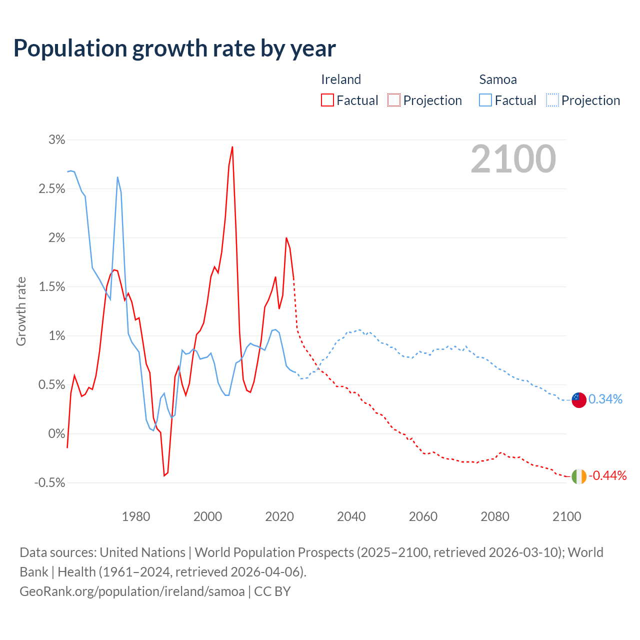 - For the last 10 years, Ireland has had an average growth rate of +1.41% per year vs +0.87% in Samoa.