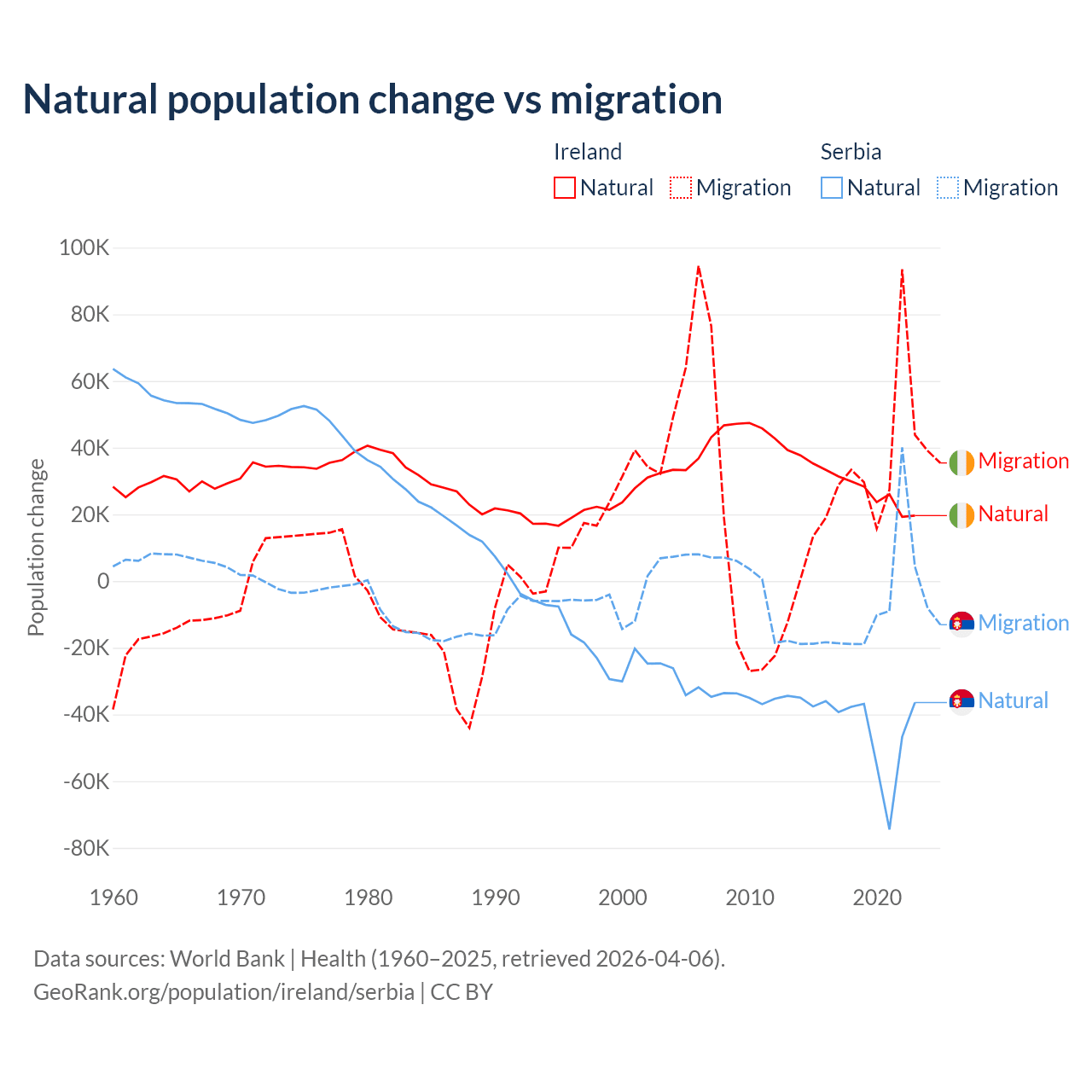 Over the last 10 years, 48.2% of the population change in Ireland is from natural causes (a gain of 284,644 people) and 51.8% is from migration (a gain of 305,297 people). In Serbia 83.3% is from natural causes (a loss of 435,148 people) and 16.7% is from migration (a loss of 87,110 people).