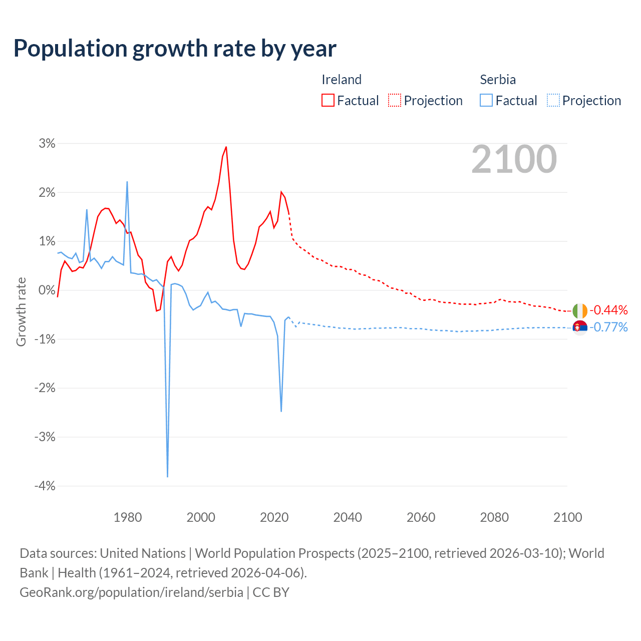- For the last 10 years, Ireland has had an average growth rate of +1.41% per year vs -0.76% in Serbia.