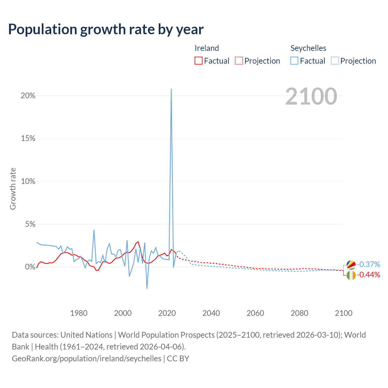 - For the last 10 years, Ireland has had an average growth rate of +1.41% per year vs +2.9% in the Seychelles.