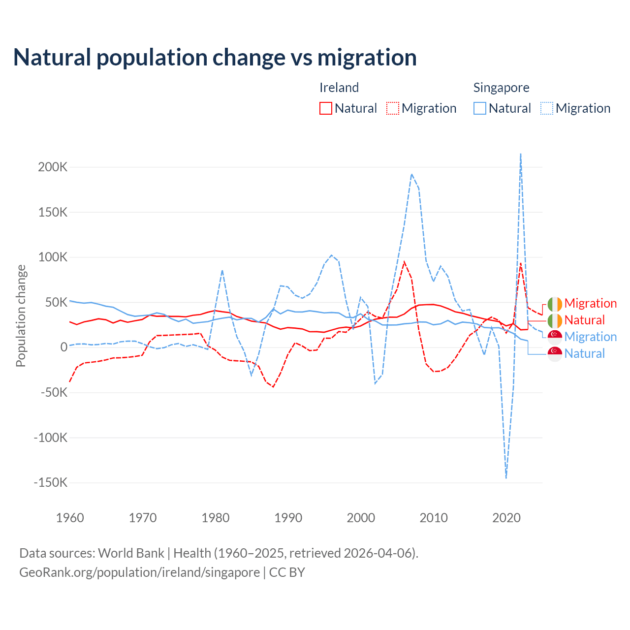 Over the last 10 years, 48.2% of the population change in Ireland is from natural causes (a gain of 284,644 people) and 51.8% is from migration (a gain of 305,297 people). In Singapore 54.8% is from natural causes (a gain of 195,953 people) and 45.2% is from migration (a gain of 161,805 people).