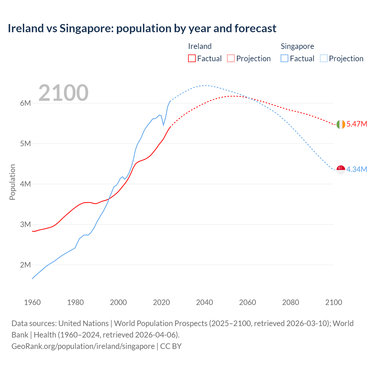 Ireland vs Singapore: population by year and forecast