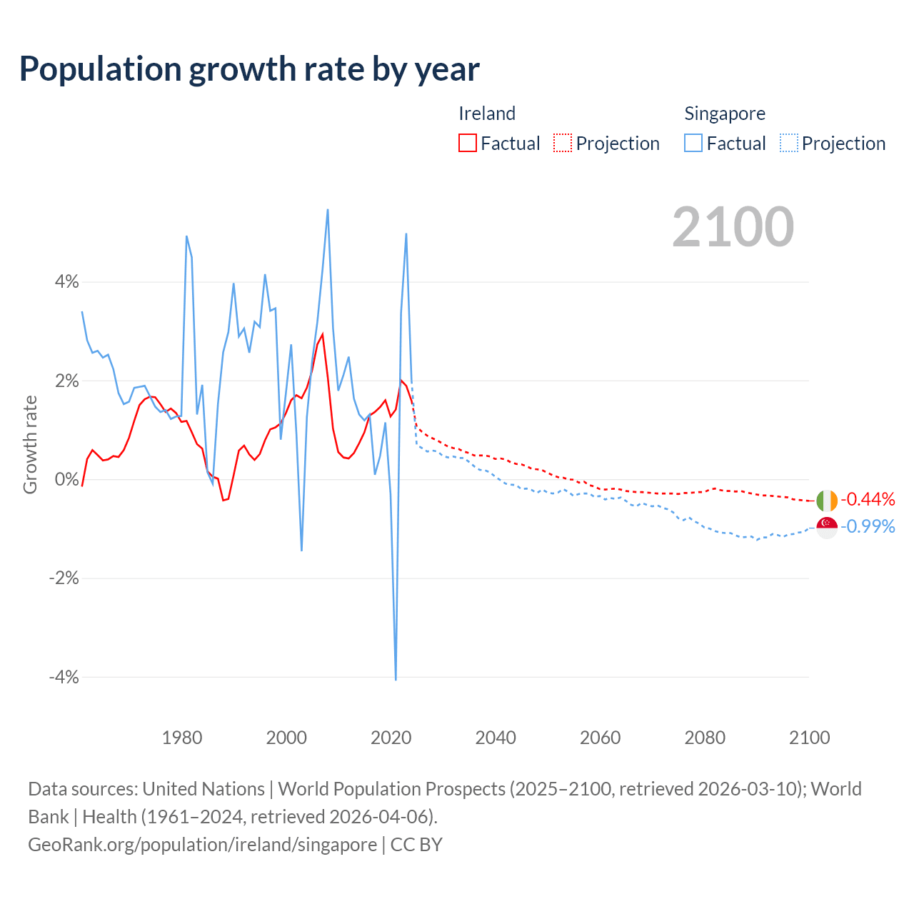 - For the last 10 years, Ireland has had an average growth rate of +1.41% per year vs +1.04% in Singapore.