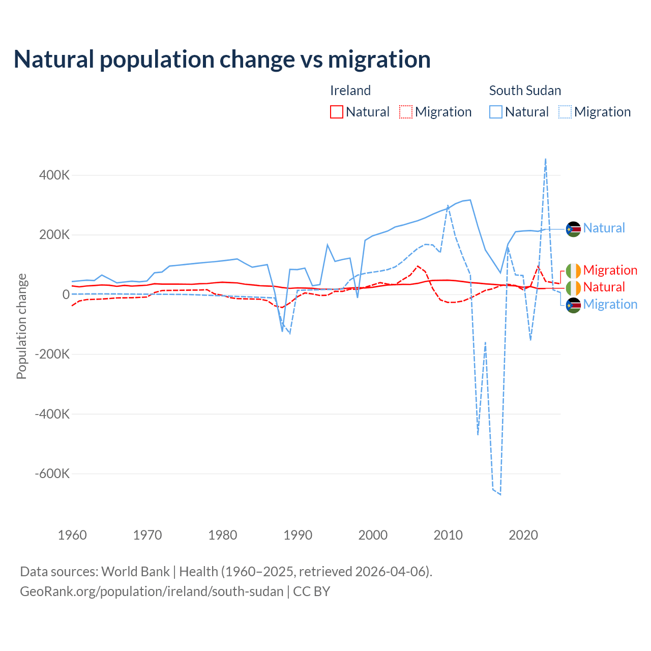 Over the last 10 years, 48.2% of the population change in Ireland is from natural causes (a gain of 284,644 people) and 51.8% is from migration (a gain of 305,297 people). In South Sudan 57.4% is from natural causes (a gain of 1,792,135 people) and 42.6% is from migration (a loss of 1,329,606 people).