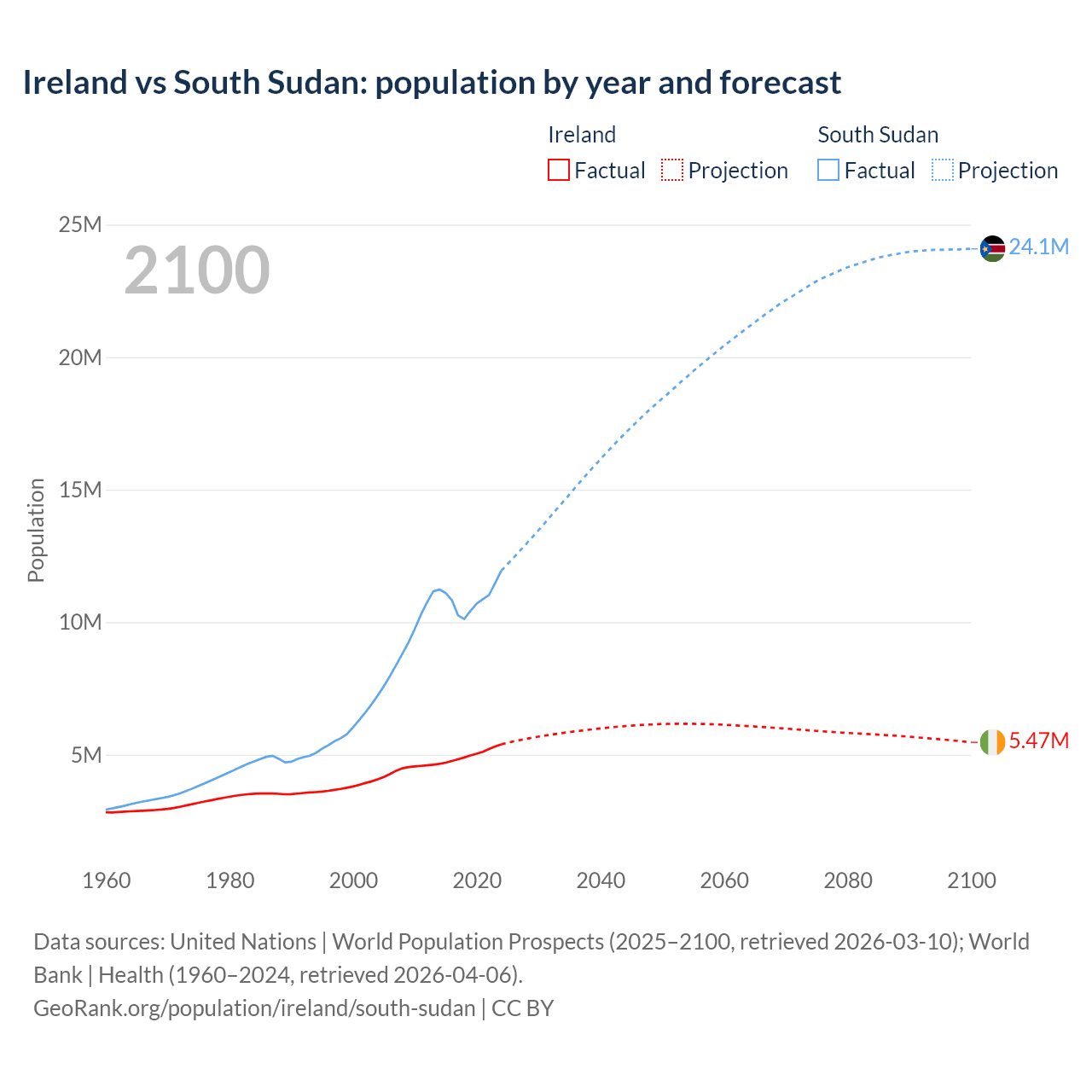 The latest officially reported population of Ireland was 5,395,790 in 2024 vs 11,943,408 people in South Sudan in 2024. In 2026, based on the adjusted UN estimation, the current Ireland's population is 5,518,360 people compared to 12,507,858 in South Sudan.