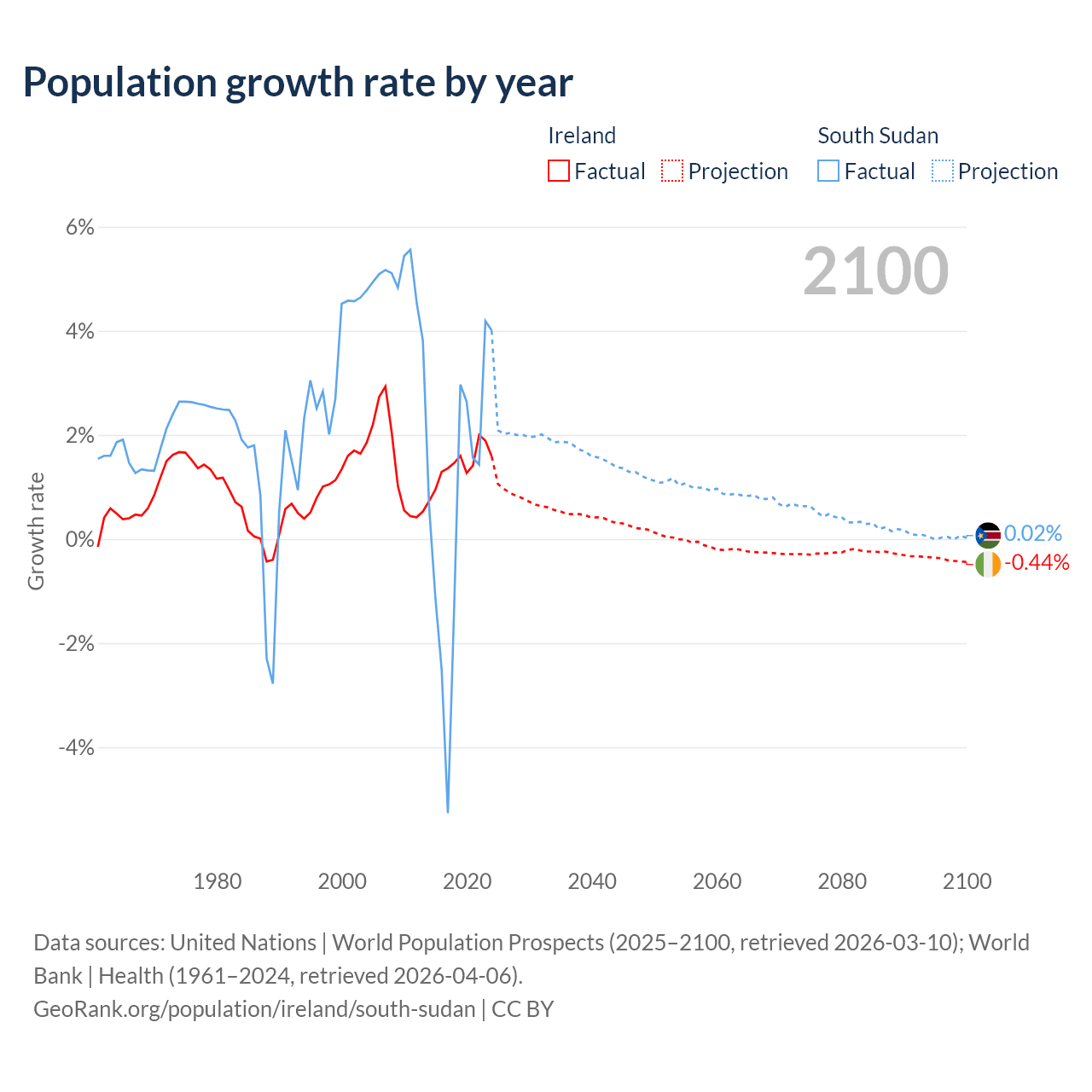 - For the last 10 years, Ireland has had an average growth rate of +1.41% per year vs +0.65% in South Sudan.