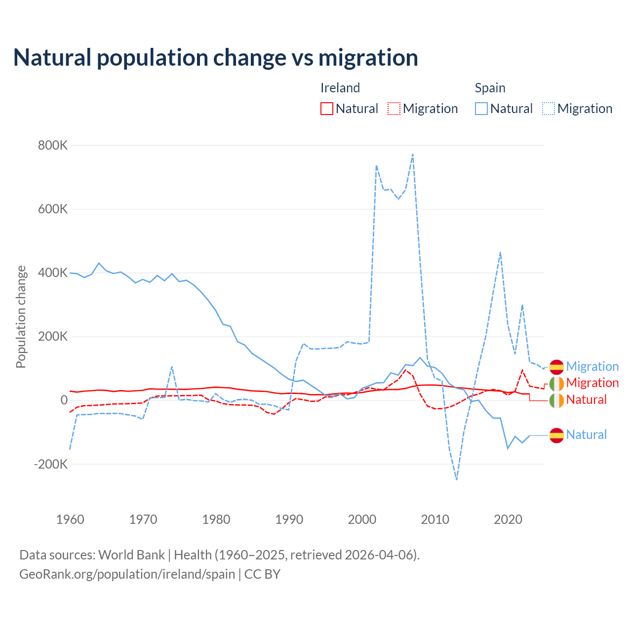Over the last 10 years, 48.2% of the population change in Ireland is from natural causes (a gain of 284,644 people) and 51.8% is from migration (a gain of 305,297 people). In Spain 25.8% is from natural causes (a loss of 627,829 people) and 74.2% is from migration (a gain of 1,810,127 people).