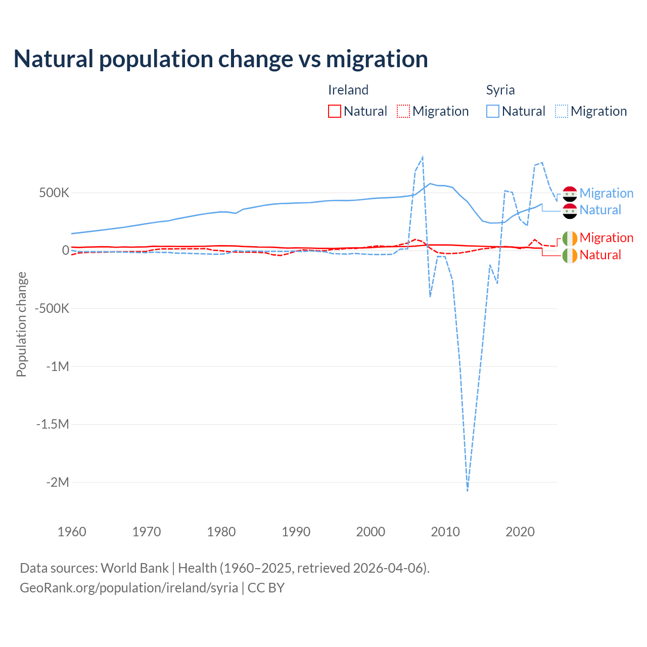 Over the last 10 years, 48.2% of the population change in Ireland is from natural causes (a gain of 284,644 people) and 51.8% is from migration (a gain of 305,297 people). In Syria 91.3% is from natural causes (a gain of 3,047,621 people) and 8.72% is from migration (a gain of 291,069 people).