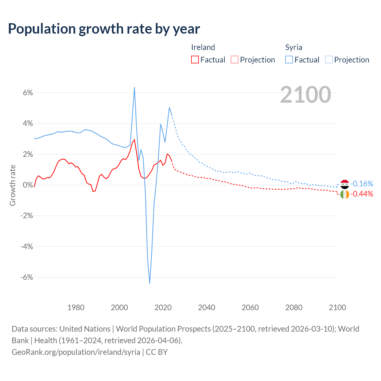 - For the last 10 years, Ireland has had an average growth rate of +1.41% per year vs +1.25% in Syria.