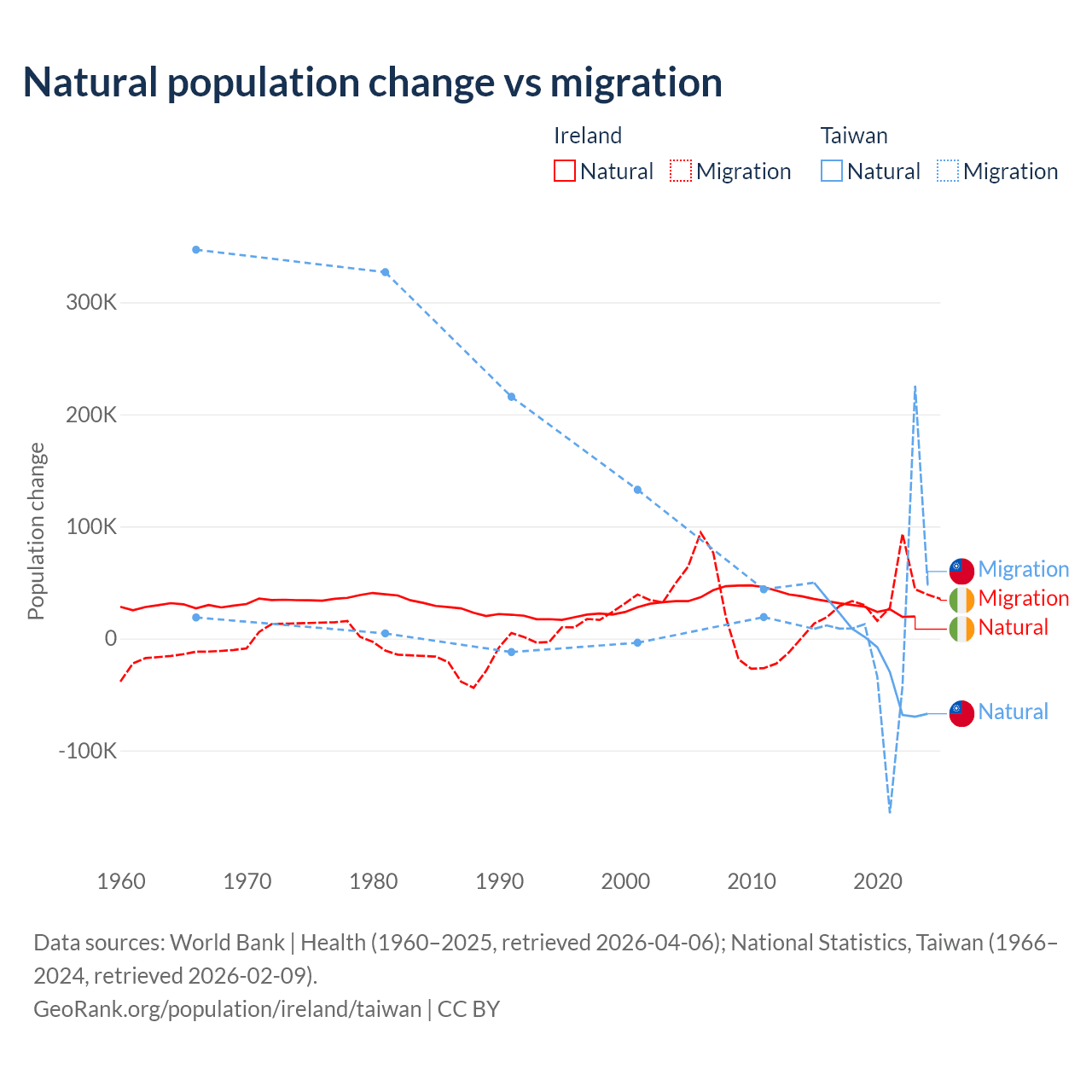 Over the last 10 years, 48.2% of the population change in Ireland is from natural causes (a gain of 284,644 people) and 51.8% is from migration (a gain of 305,297 people). In Taiwan 56.7% is from natural causes (a loss of 57,467 people) and 43.3% is from migration (a gain of 43,884 people).