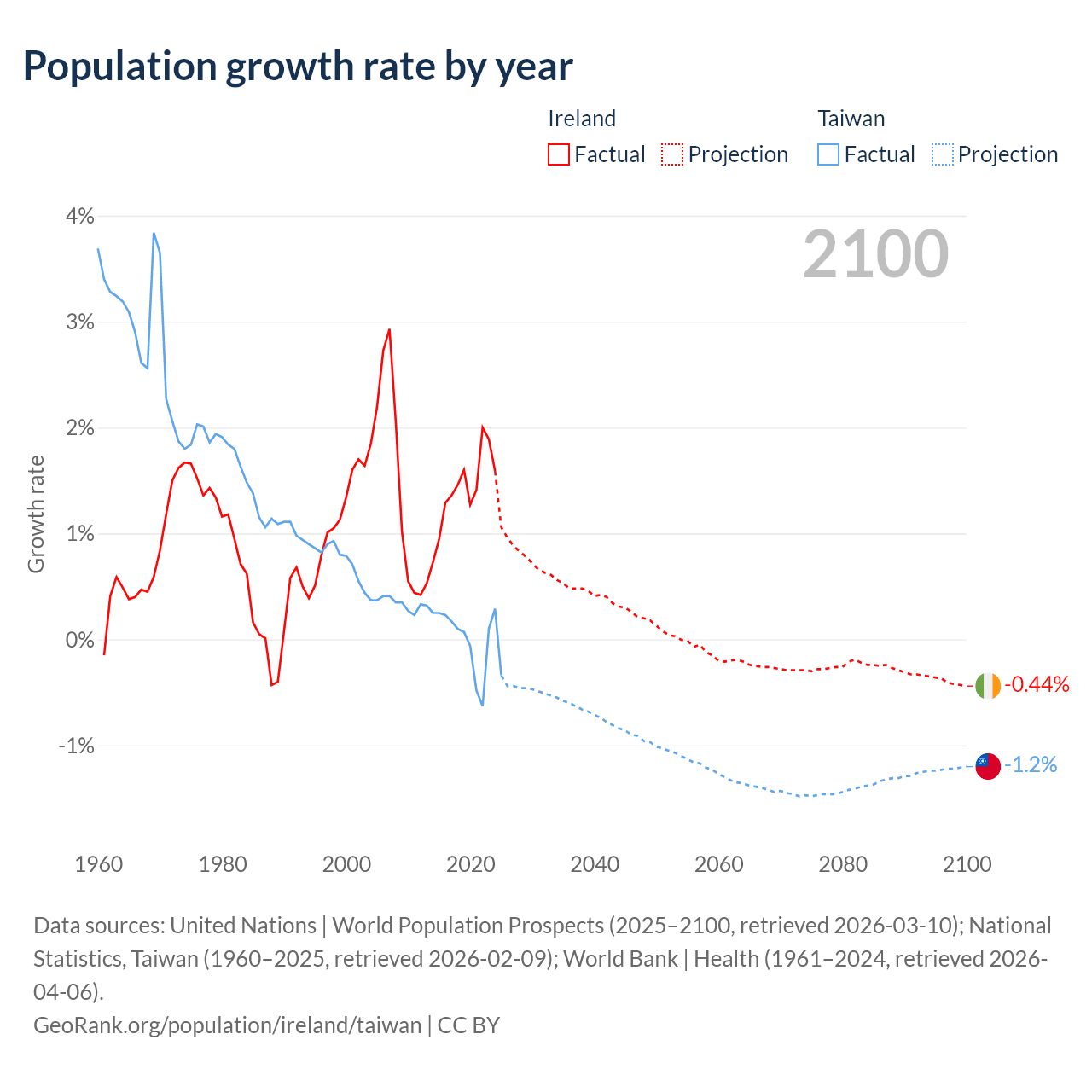 - For the last 10 years, Ireland has had an average growth rate of +1.41% per year vs -0.03% in Taiwan.