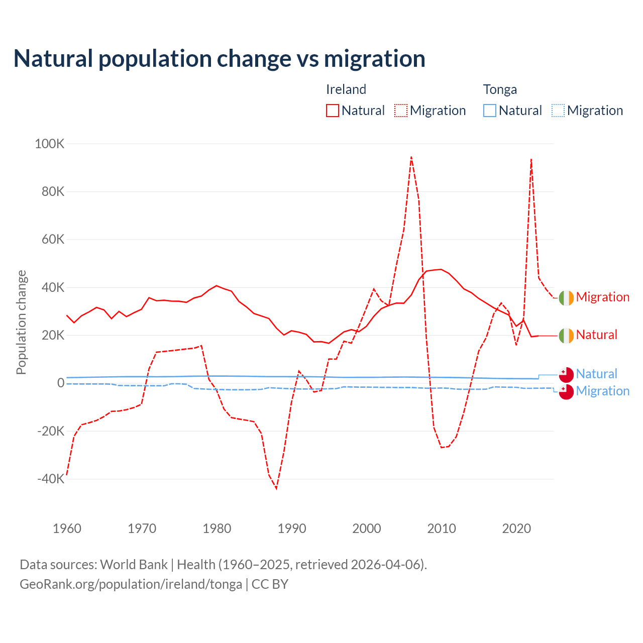 Over the last 10 years, 48.2% of the population change in Ireland is from natural causes (a gain of 284,644 people) and 51.8% is from migration (a gain of 305,297 people). In Tonga 46.9% is from natural causes (a gain of 18,919 people) and 53.1% is from migration (a loss of 21,384 people).