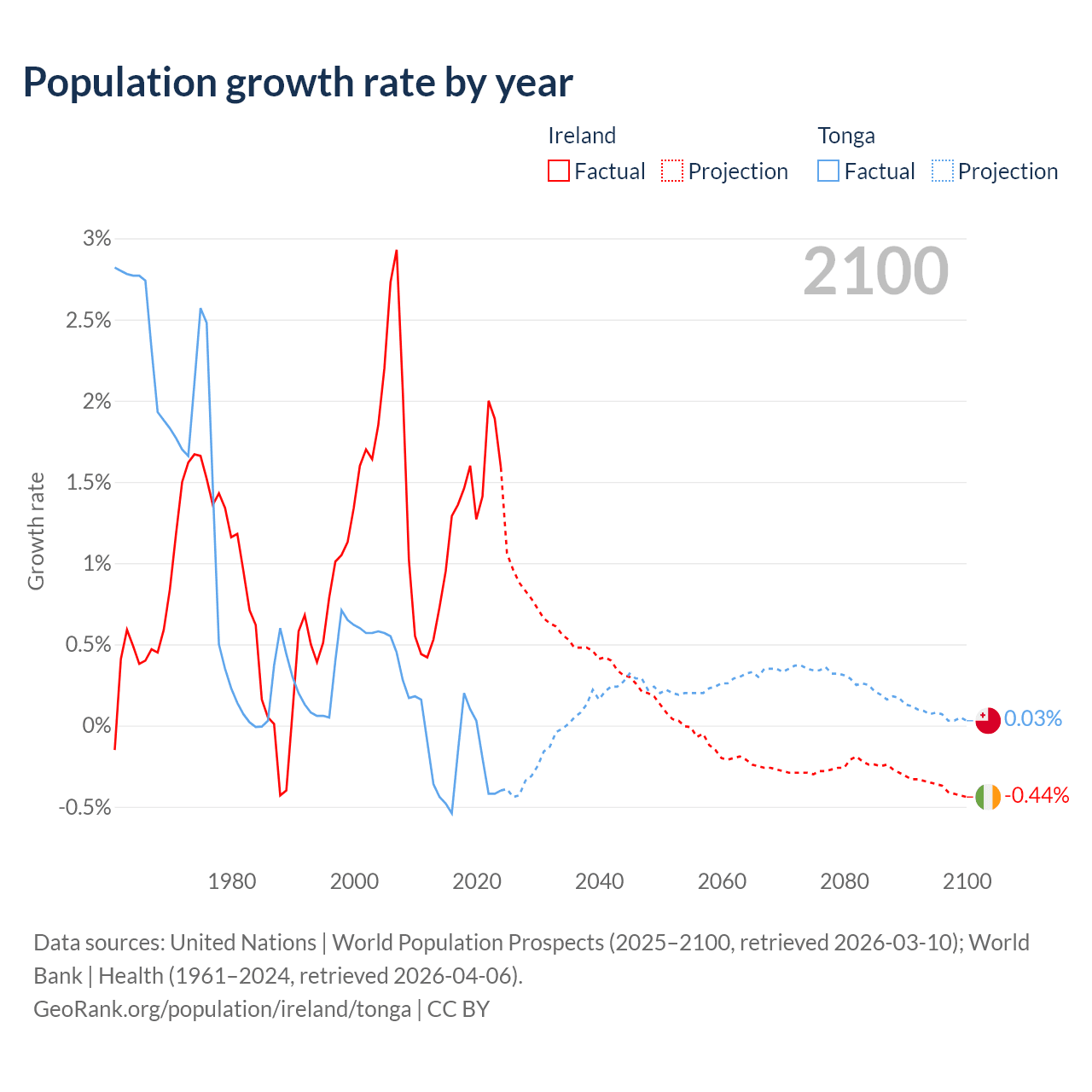 - For the last 10 years, Ireland has had an average growth rate of +1.41% per year vs -0.25% in Tonga.