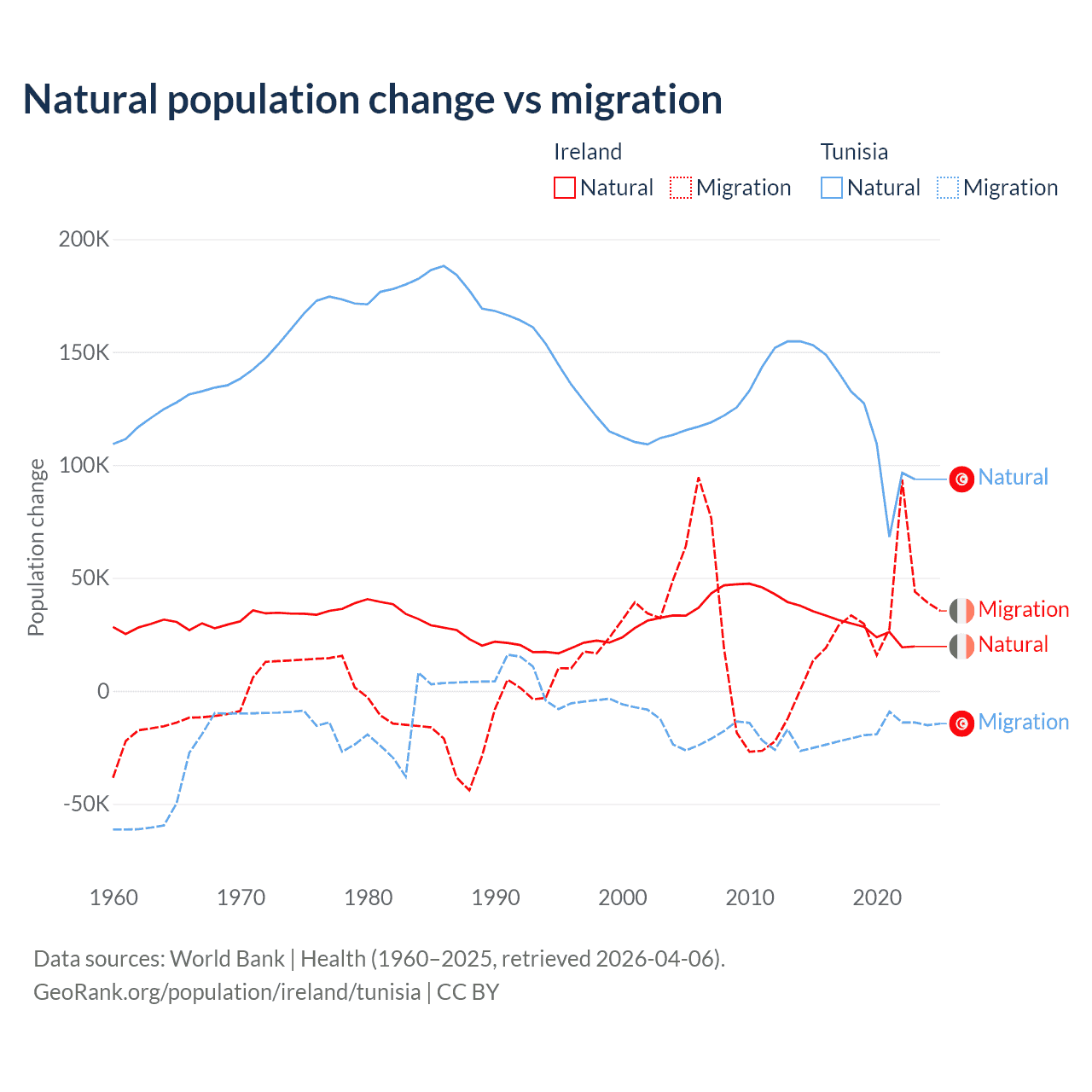 Over the last 10 years, 48.2% of the population change in Ireland is from natural causes (a gain of 284,644 people) and 51.8% is from migration (a gain of 305,297 people). In Tunisia 86.3% is from natural causes (a gain of 1,225,079 people) and 13.7% is from migration (a loss of 195,011 people).