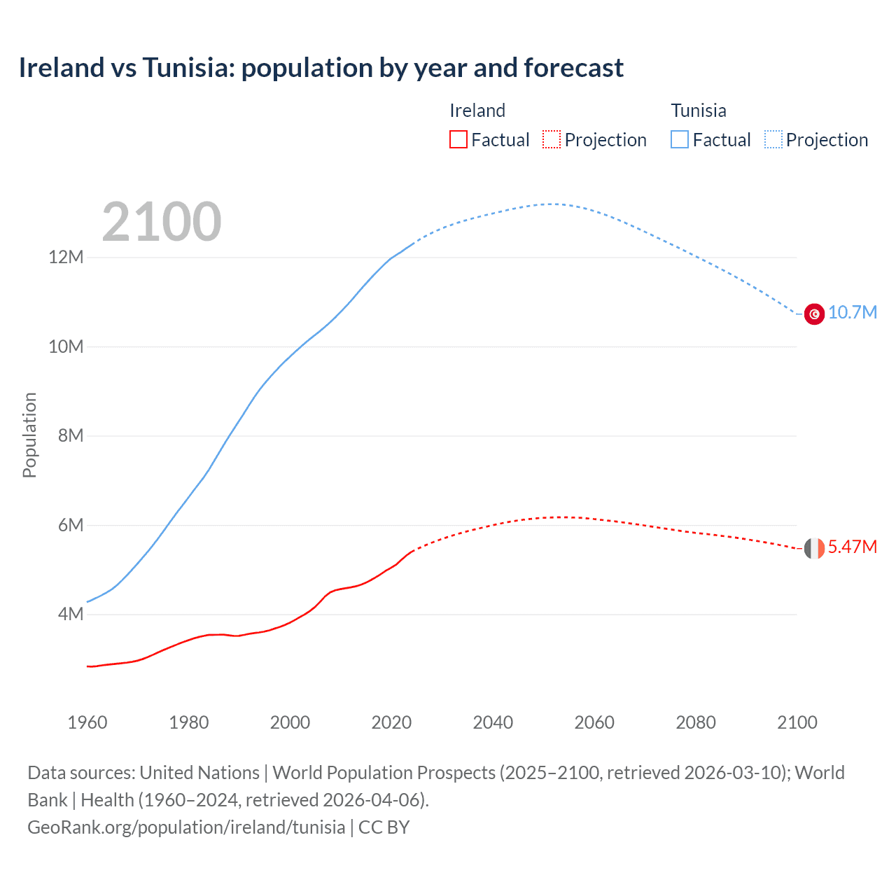 The latest officially reported population of Ireland was 5,395,790 in 2024 vs 12,277,109 people in Tunisia in 2024. In 2026, based on the adjusted UN estimation, the current Ireland's population is 5,518,360 people compared to 12,437,803 in Tunisia.