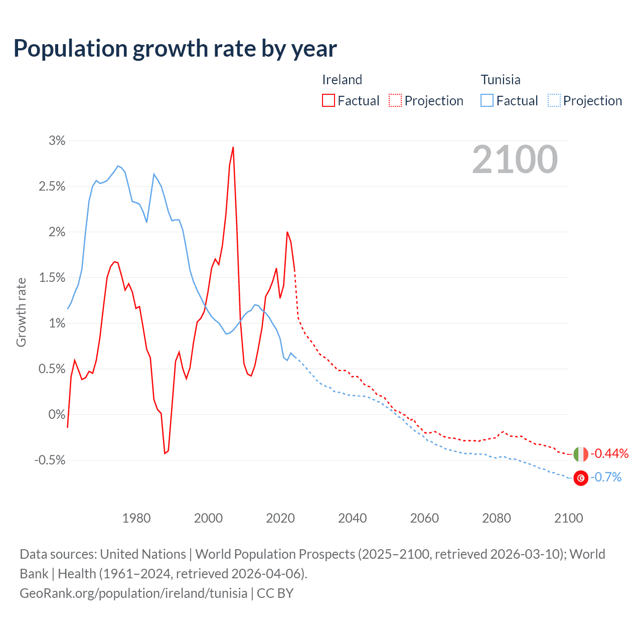 - For the last 10 years, Ireland has had an average growth rate of +1.41% per year vs +0.89% in Tunisia.