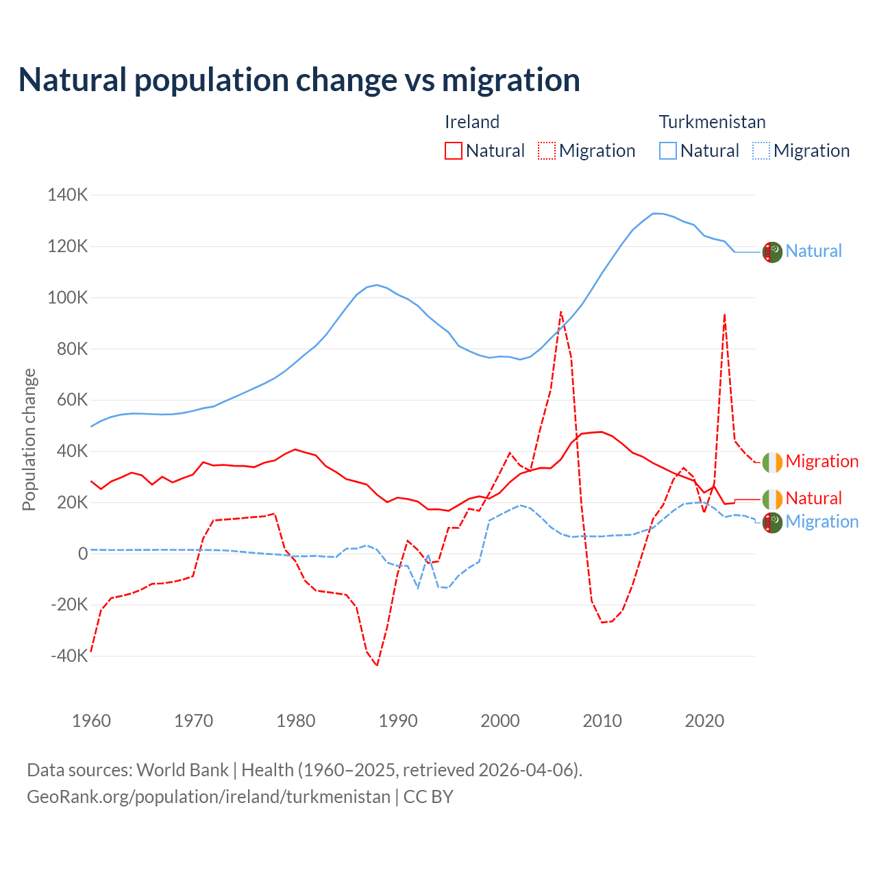 Over the last 10 years, 48.2% of the population change in Ireland is from natural causes (a gain of 284,644 people) and 51.8% is from migration (a gain of 305,297 people). In Turkmenistan 89.2% is from natural causes (a gain of 1,270,228 people) and 10.8% is from migration (a gain of 154,379 people).