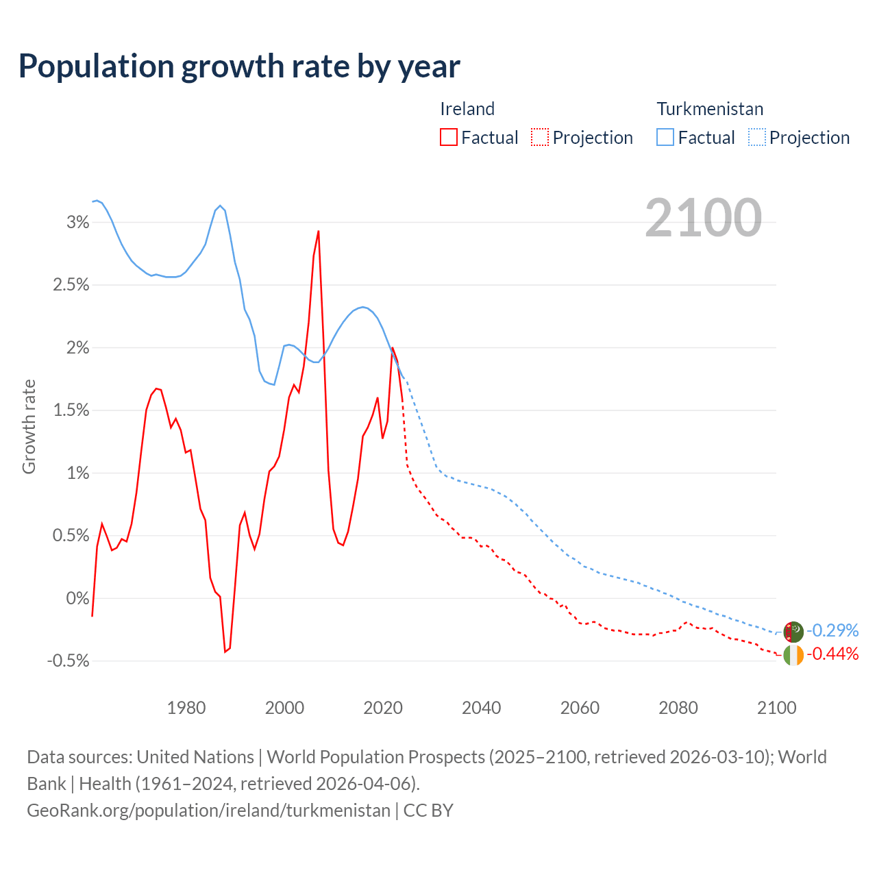 - For the last 10 years, Ireland has had an average growth rate of +1.41% per year vs +2.14% in Turkmenistan.