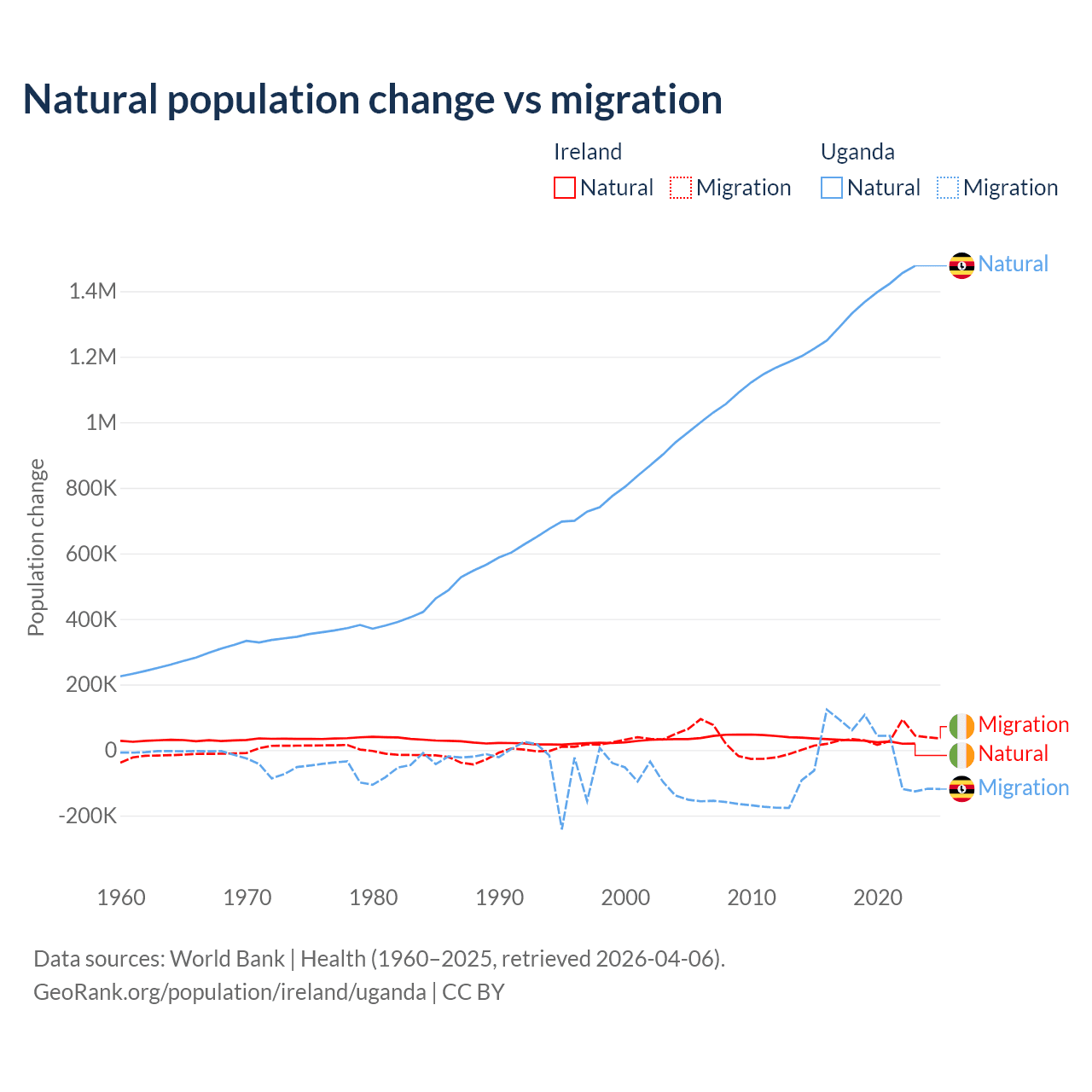 Over the last 10 years, 48.2% of the population change in Ireland is from natural causes (a gain of 284,644 people) and 51.8% is from migration (a gain of 305,297 people). In Uganda 99.5% is from natural causes (a gain of 13,419,712 people) and 0.53% is from migration (a gain of 71,457 people).