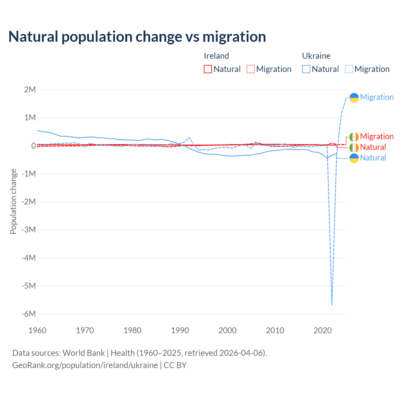 Over the last 10 years, 48.2% of the population change in Ireland is from natural causes (a gain of 284,644 people) and 51.8% is from migration (a gain of 305,297 people). In Ukraine 28.2% is from natural causes (a loss of 2,435,153 people) and 71.8% is from migration (a loss of 6,198,995 people).