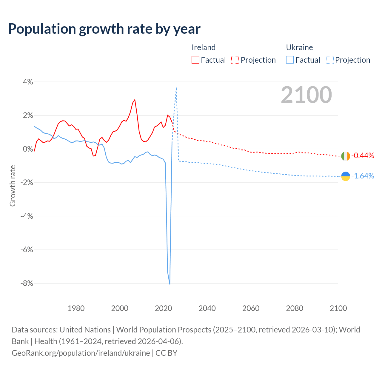- For the last 10 years, Ireland has had an average growth rate of +1.41% per year vs -1.74% in Ukraine.