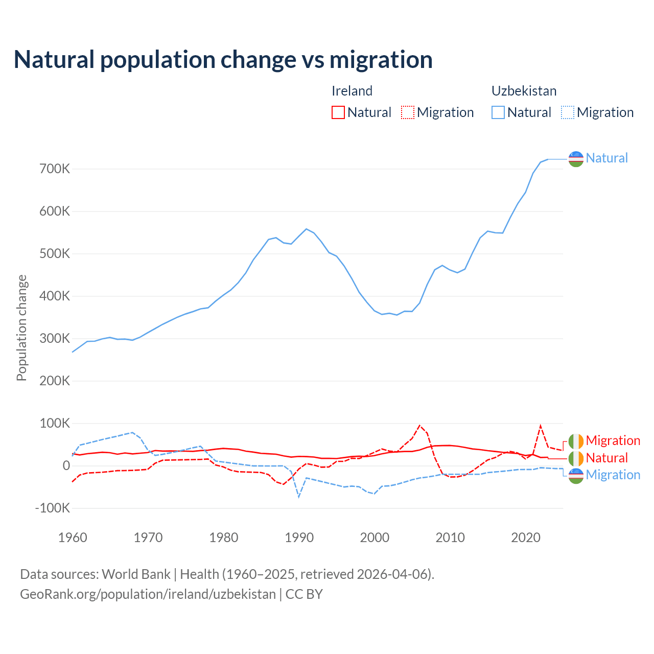 Over the last 10 years, 48.2% of the population change in Ireland is from natural causes (a gain of 284,644 people) and 51.8% is from migration (a gain of 305,297 people). In Uzbekistan 98.2% is from natural causes (a gain of 6,161,117 people) and 1.84% is from migration (a loss of 115,398 people).