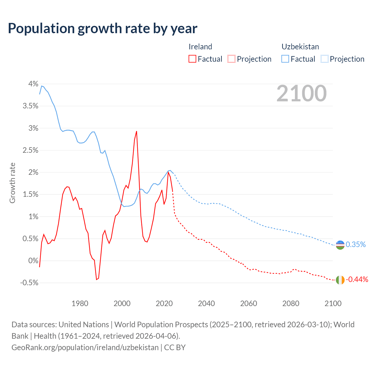 - For the last 10 years, Ireland has had an average growth rate of +1.41% per year vs +1.85% in Uzbekistan.