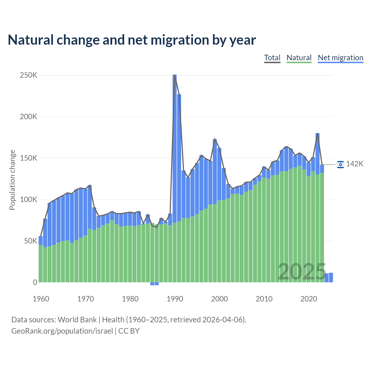 Over the last 10 years, 86% of the population change in Israel is from natural causes (a gain of 1,343,492 people) and 14% is from migration (a gain of 219,048 people).
