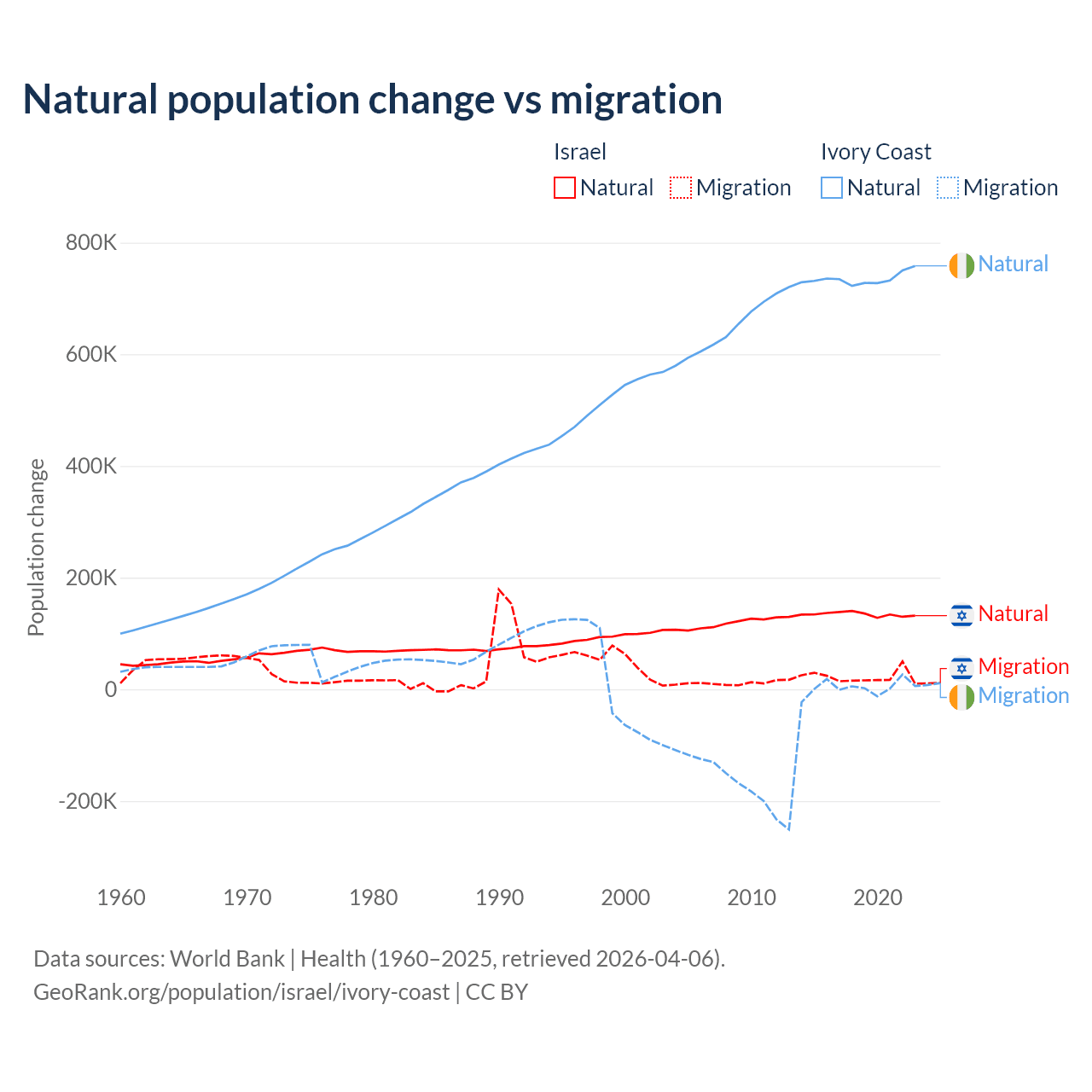 Over the last 10 years, 86% of the population change in Israel is from natural causes (a gain of 1,343,492 people) and 14% is from migration (a gain of 219,048 people). In Ivory Coast 99.7% is from natural causes (a gain of 7,348,944 people) and 0.33% is from migration (a gain of 24,432 people).