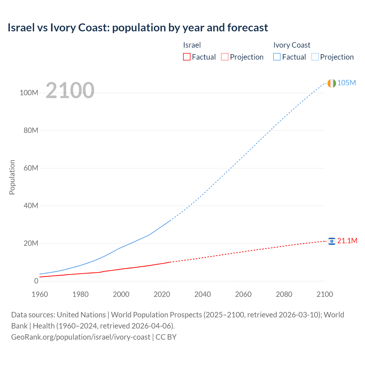 The latest officially reported population of Israel was 9,974,400 in 2024 vs 31,934,230 people in Ivory Coast in 2024. In 2026, based on the adjusted UN estimation, the current Israel's population is 10,290,887 people compared to 33,722,528 in Ivory Coast.