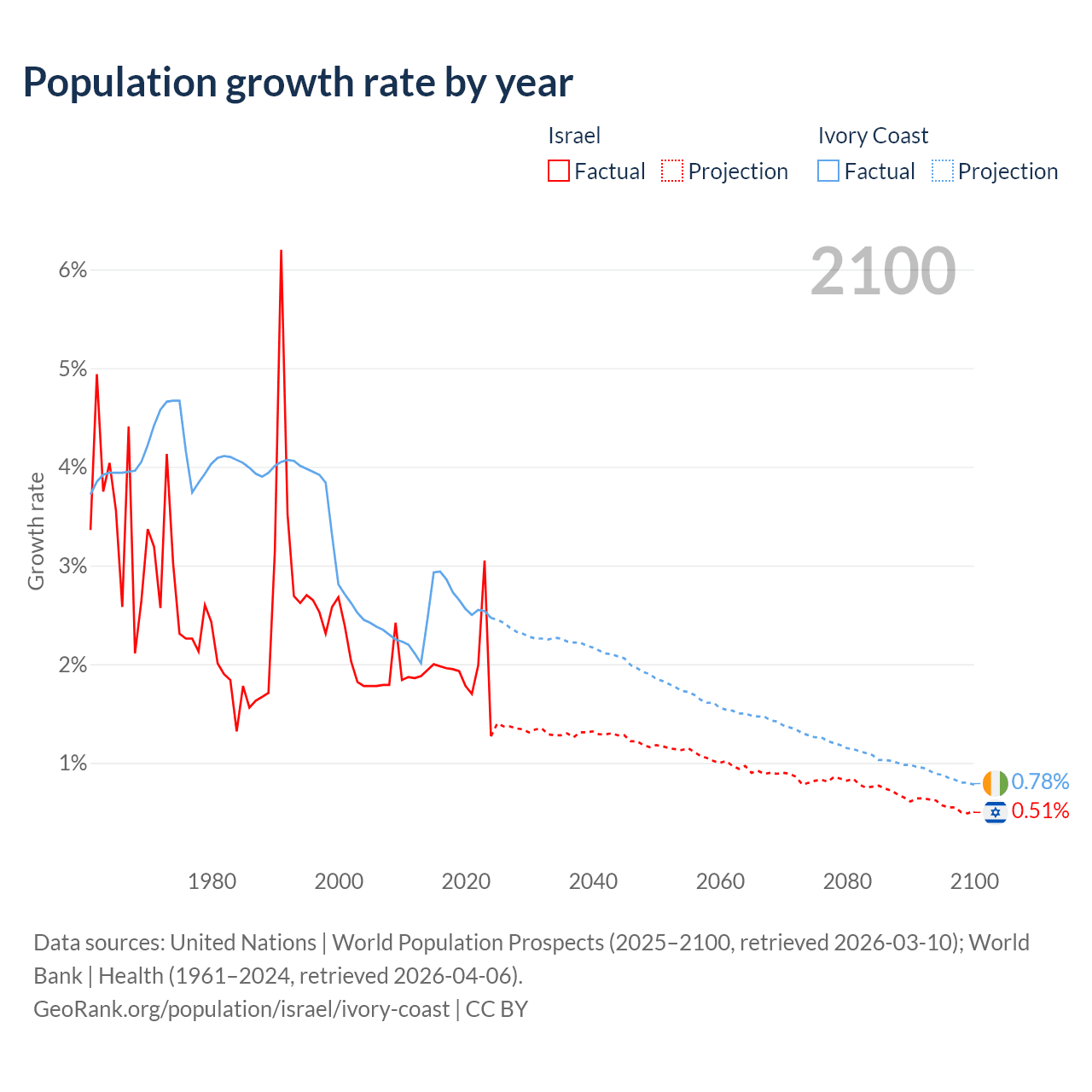 - For the last 10 years, Israel has had an average growth rate of +1.96% per year vs +2.65% in Ivory Coast.