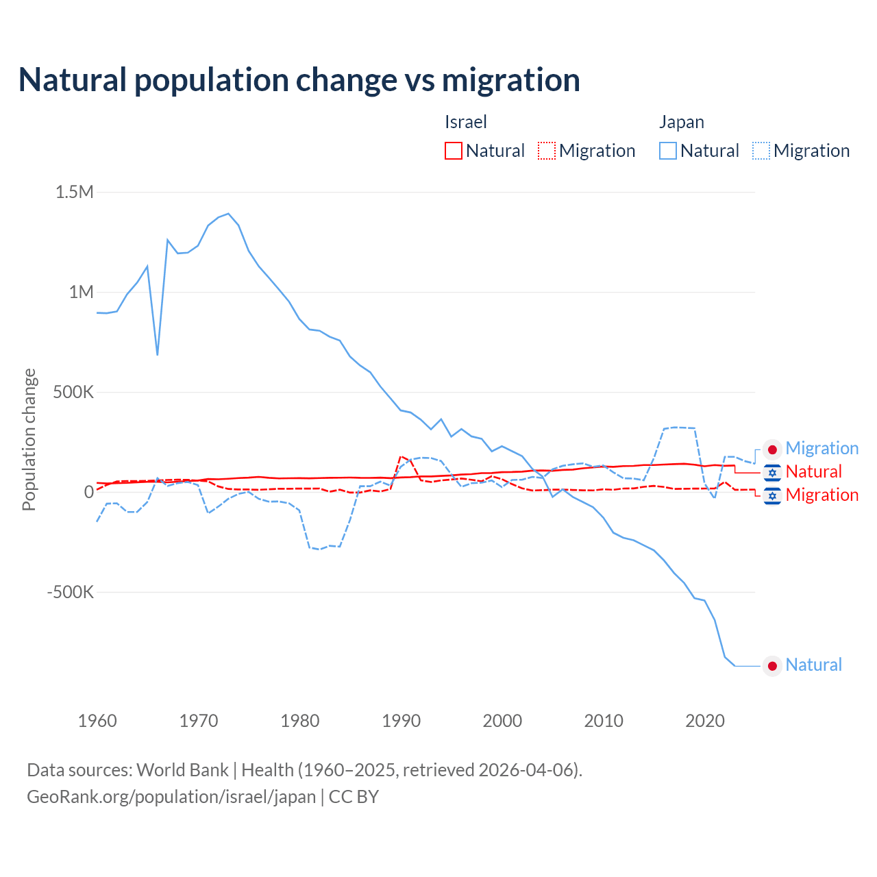 Over the last 10 years, 86% of the population change in Israel is from natural causes (a gain of 1,343,492 people) and 14% is from migration (a gain of 219,048 people). In Japan 73.6% is from natural causes (a loss of 5,178,838 people) and 26.4% is from migration (a gain of 1,860,103 people).