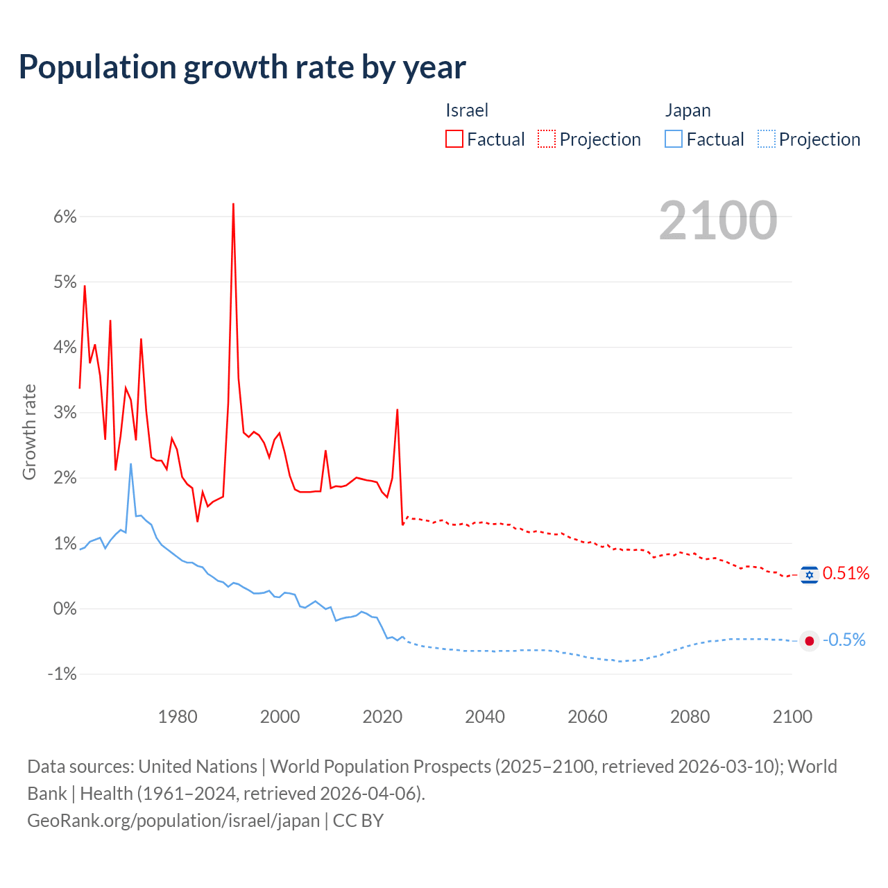Data sources: World Bank | Health (1960–2024, retrieved 2026-04-06); United Nations | World Population Prospects (1960–2026, retrieved 2026-03-10); U.S. Census Bureau (1960–2025, retrieved 2026-02-08); Central Intelligence Agency (CIA) (2000–2019, retrieved 2026-02-20).