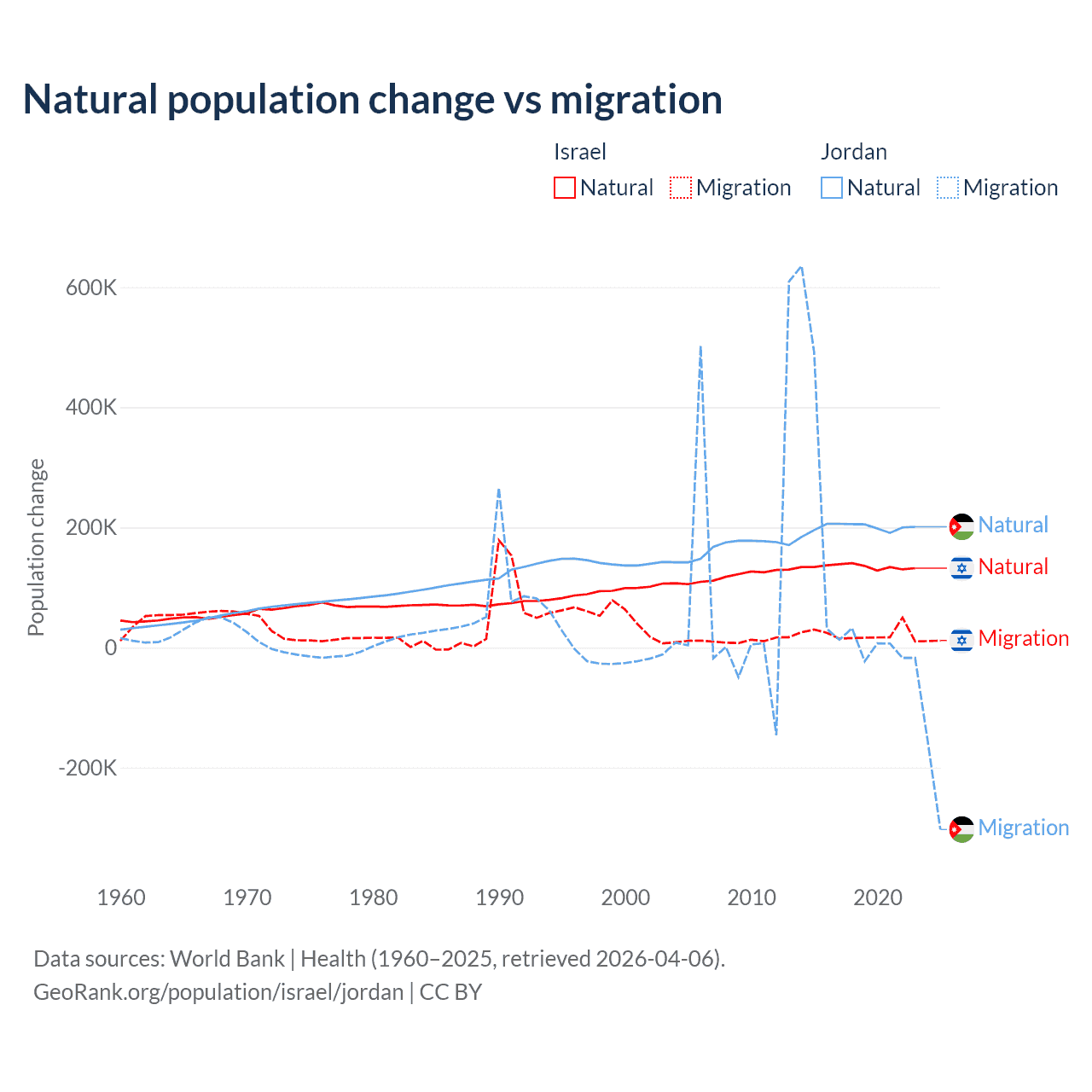 Over the last 10 years, 86% of the population change in Israel is from natural causes (a gain of 1,343,492 people) and 14% is from migration (a gain of 219,048 people). In Jordan 63.2% is from natural causes (a gain of 1,991,452 people) and 36.8% is from migration (a gain of 1,157,625 people).