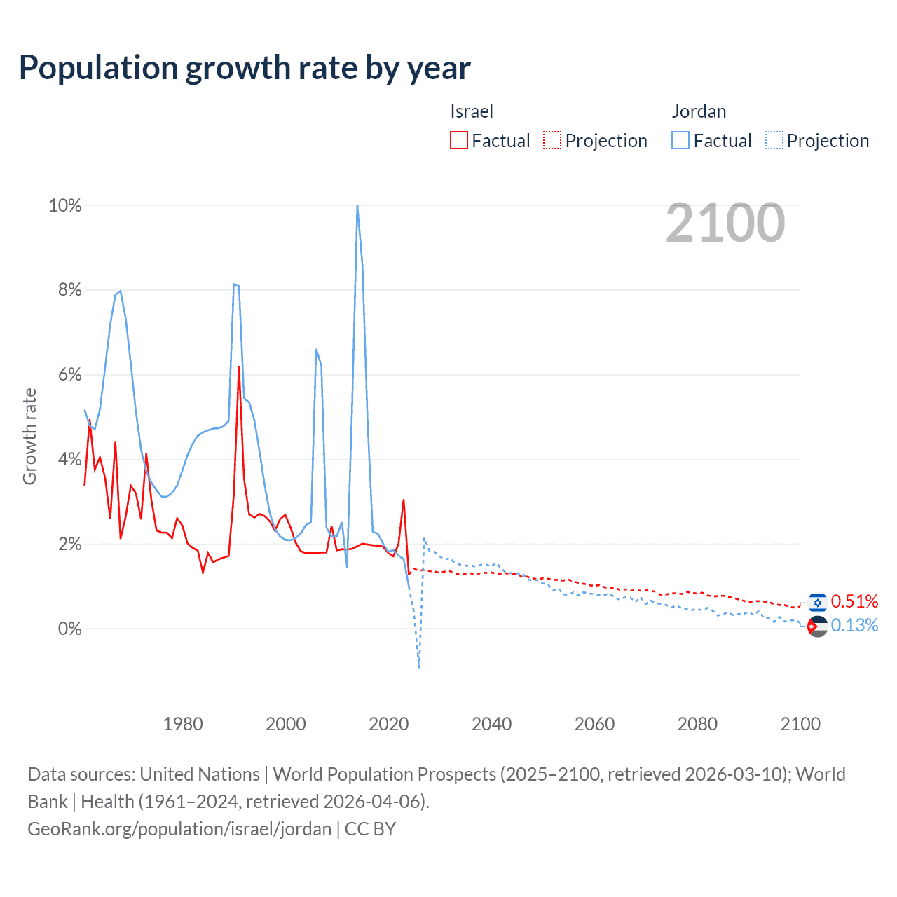 - For the last 10 years, Israel has had an average growth rate of +1.96% per year vs +3.45% in Jordan.