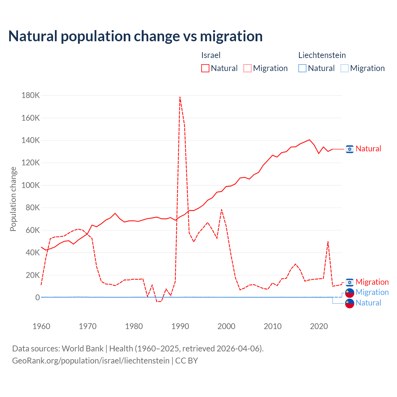 Over the last 10 years, 86% of the population change in Israel is from natural causes (a gain of 1,343,492 people) and 14% is from migration (a gain of 219,048 people). In Liechtenstein 32.4% is from natural causes (a gain of 883 people) and 67.6% is from migration (a gain of 1,843 people).