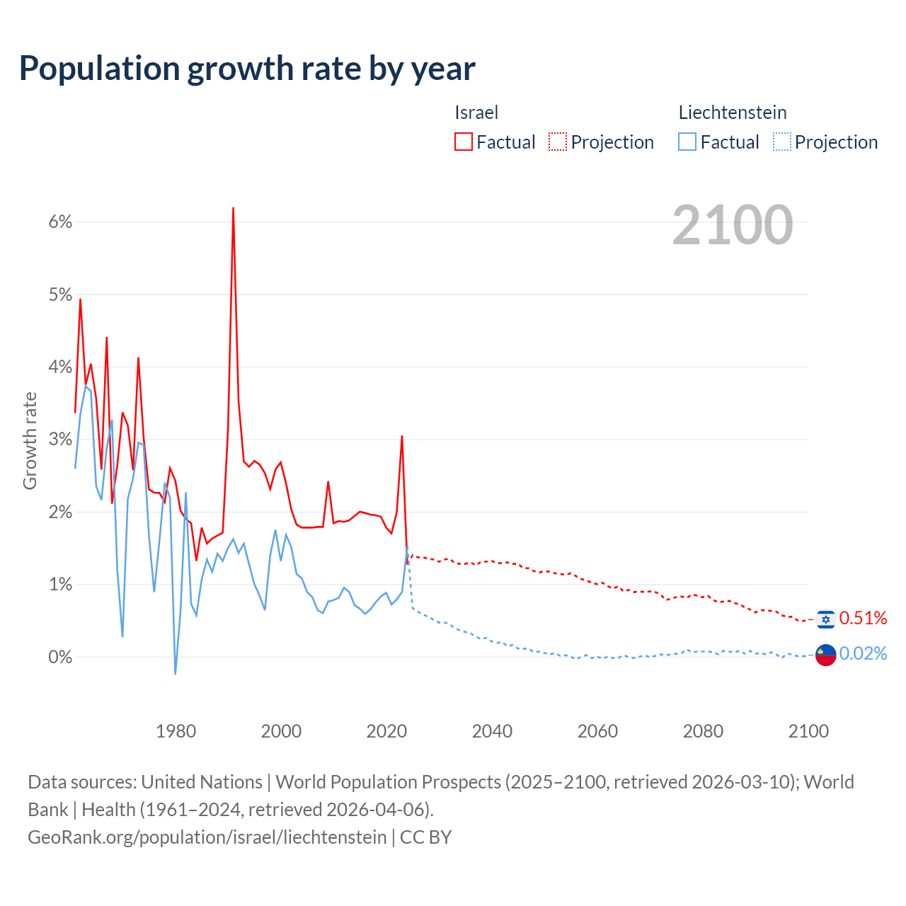 - For the last 10 years, Israel has had an average growth rate of +1.96% per year vs +0.82% in Liechtenstein.