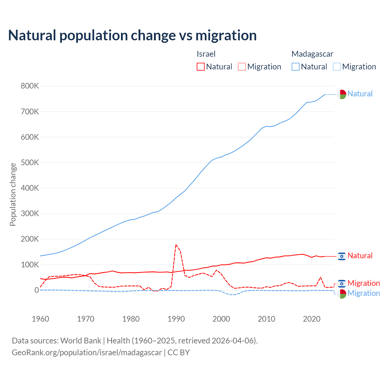 Over the last 10 years, 86% of the population change in Israel is from natural causes (a gain of 1,343,492 people) and 14% is from migration (a gain of 219,048 people). In Madagascar 99.7% is from natural causes (a gain of 7,165,578 people) and 0.31% is from migration (a loss of 22,384 people).