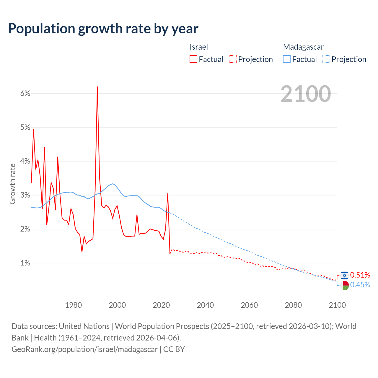 - For the last 10 years, Israel has had an average growth rate of +1.96% per year vs +2.6% in Madagascar.