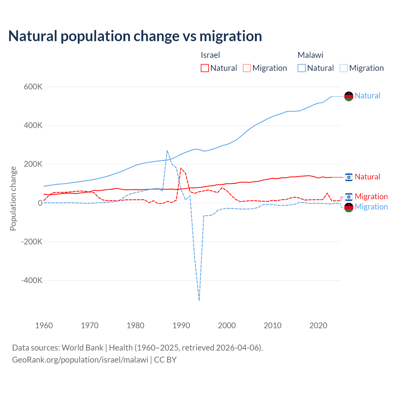 Over the last 10 years, 86% of the population change in Israel is from natural causes (a gain of 1,343,492 people) and 14% is from migration (a gain of 219,048 people). In Malawi 99.3% is from natural causes (a gain of 5,019,393 people) and 0.67% is from migration (a loss of 33,768 people).