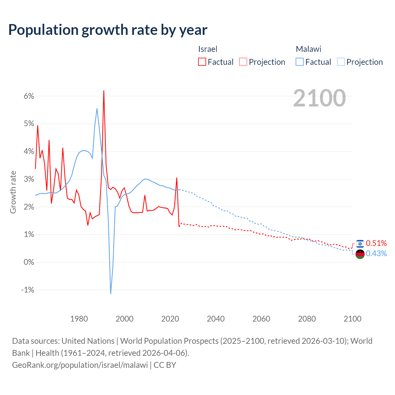- For the last 10 years, Israel has had an average growth rate of +1.96% per year vs +2.7% in Malawi.