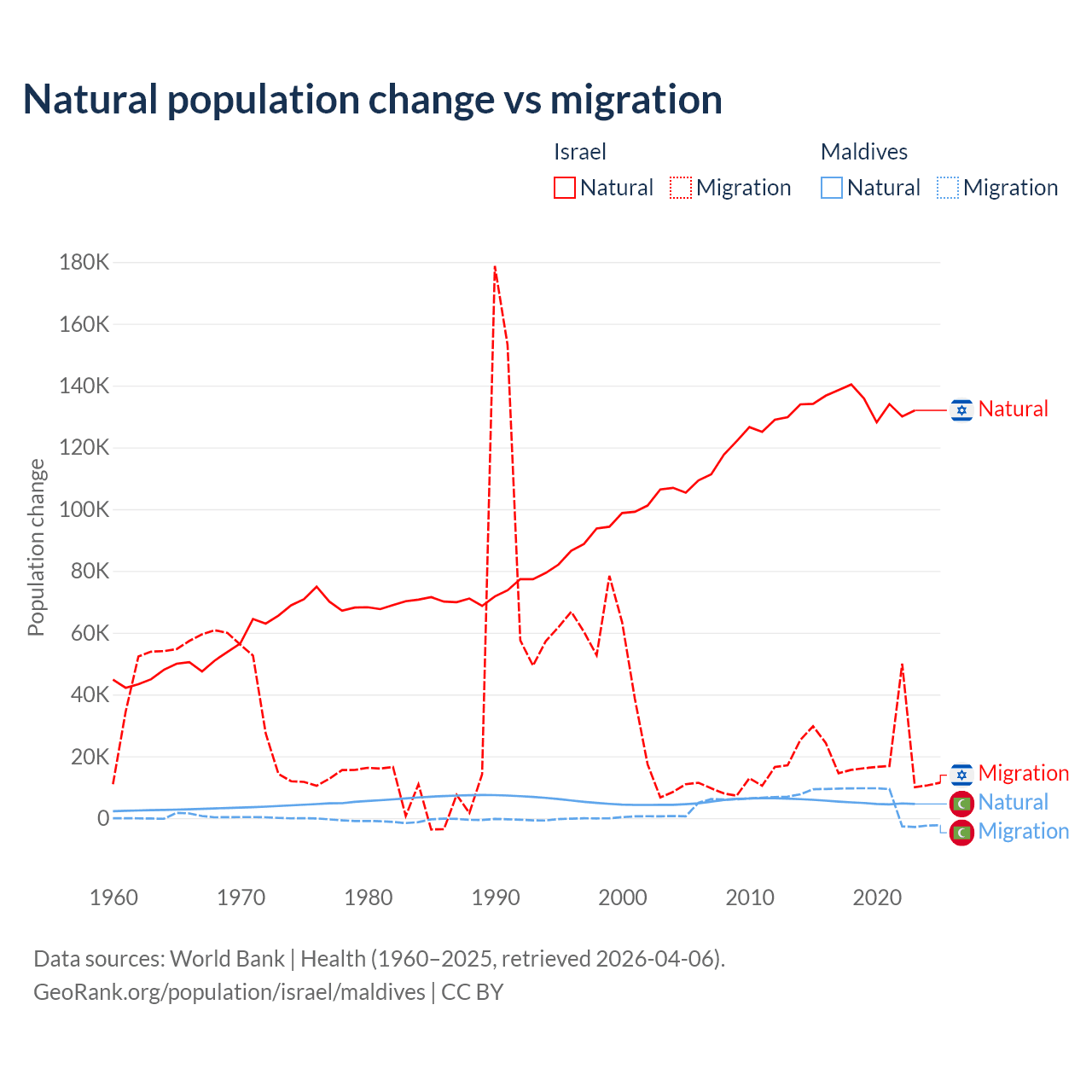 Over the last 10 years, 86% of the population change in Israel is from natural causes (a gain of 1,343,492 people) and 14% is from migration (a gain of 219,048 people). In Maldives 42.7% is from natural causes (a gain of 51,342 people) and 57.3% is from migration (a gain of 68,788 people).