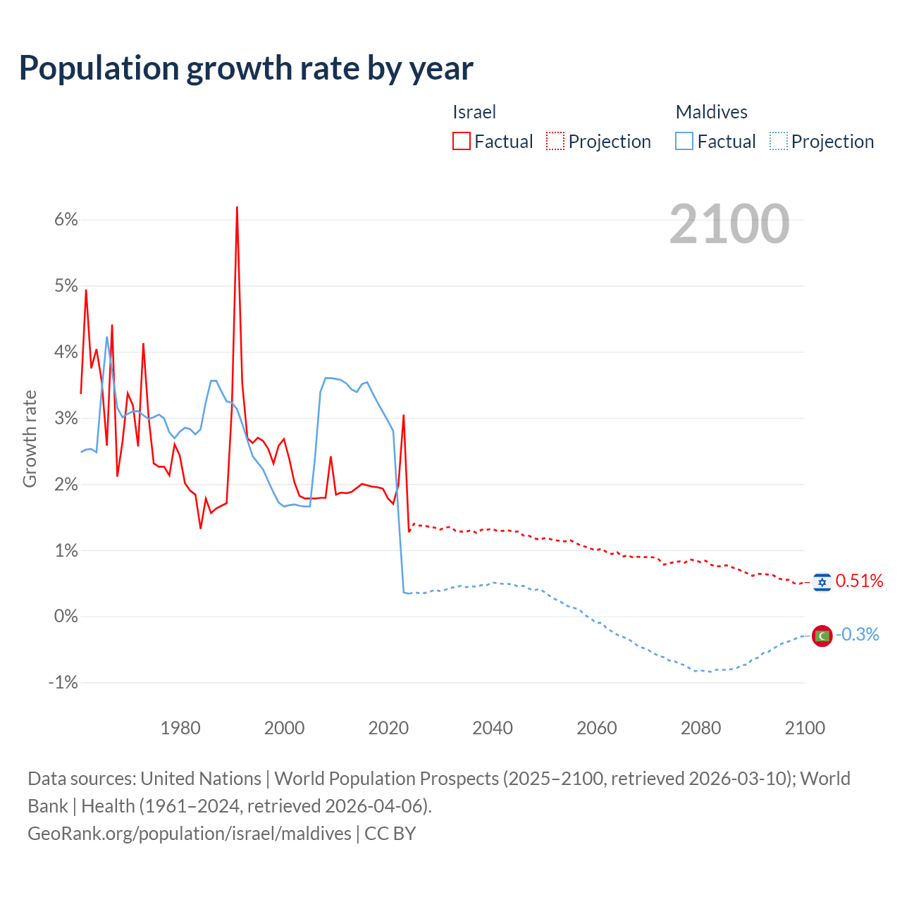 - For the last 10 years, Israel has had an average growth rate of +1.96% per year vs +2.56% in Maldives.