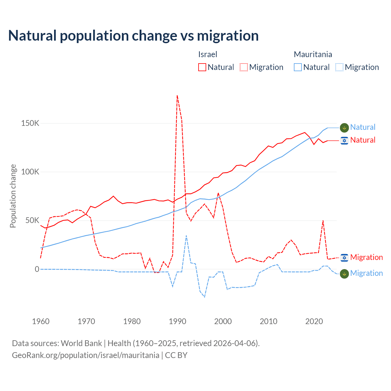 Over the last 10 years, 86% of the population change in Israel is from natural causes (a gain of 1,343,492 people) and 14% is from migration (a gain of 219,048 people). In Mauritania 98.9% is from natural causes (a gain of 1,320,903 people) and 1.12% is from migration (a loss of 14,982 people).