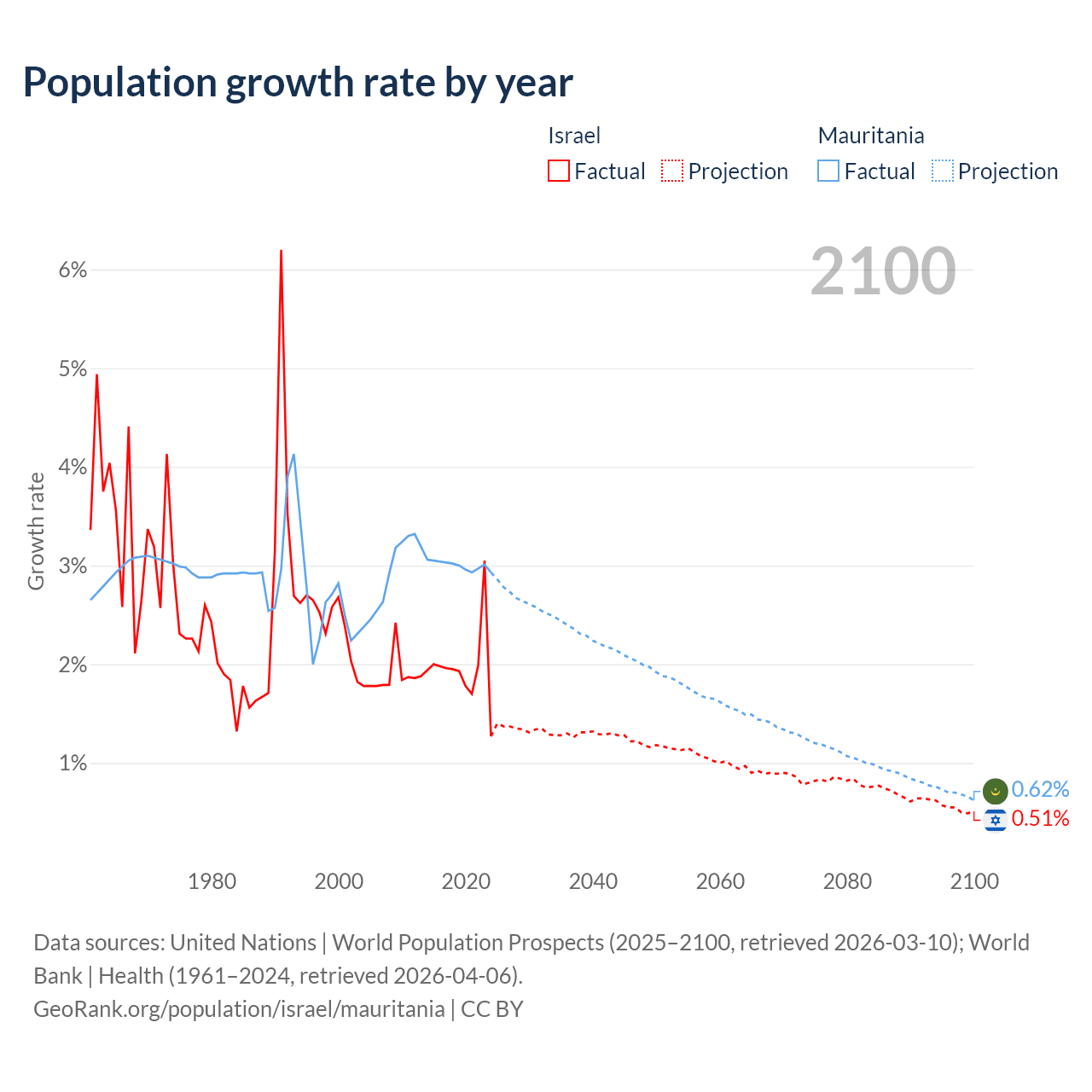 - For the last 10 years, Israel has had an average growth rate of +1.96% per year vs +3% in Mauritania.